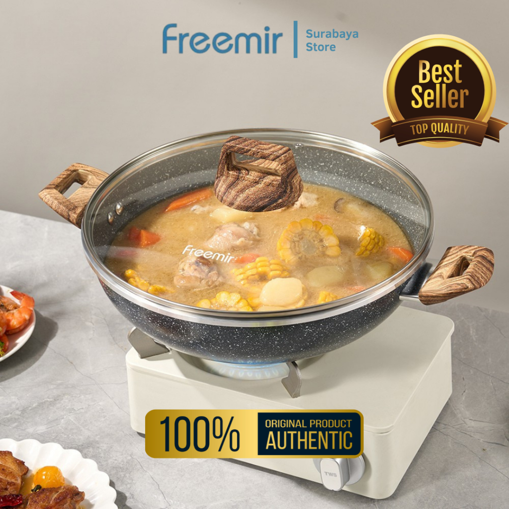 Freemir Ready Ori 100 PERSEN Wajan Teflon Gagang Kayu Granit Hitam Anti Lengket Rekomendasi