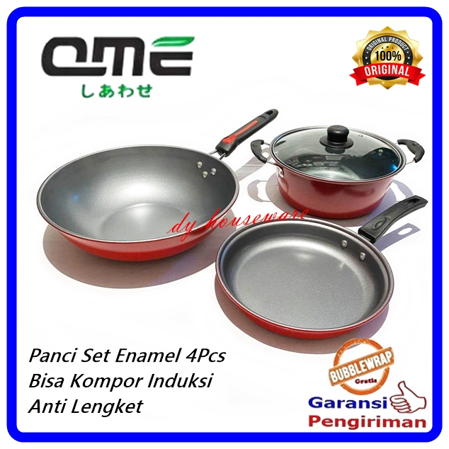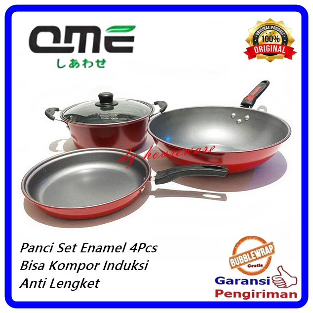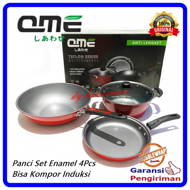 Panci Set Anti Lengket Teflon Enamel 4 Pcs Gagang Panjang Tutup Kaca Qme