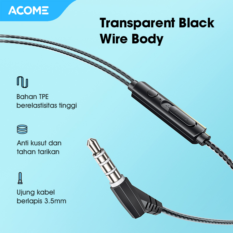 ACOME 3D Subwoofer Headphones werfull Bass Transparent Black Wire Body ACE01 Garansi Resmi 1 Tahun