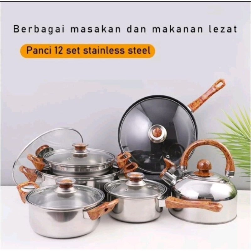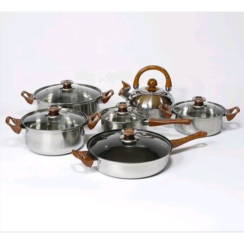 Panci Set Kayu Tutup Kaca Dan Teko Stainless
