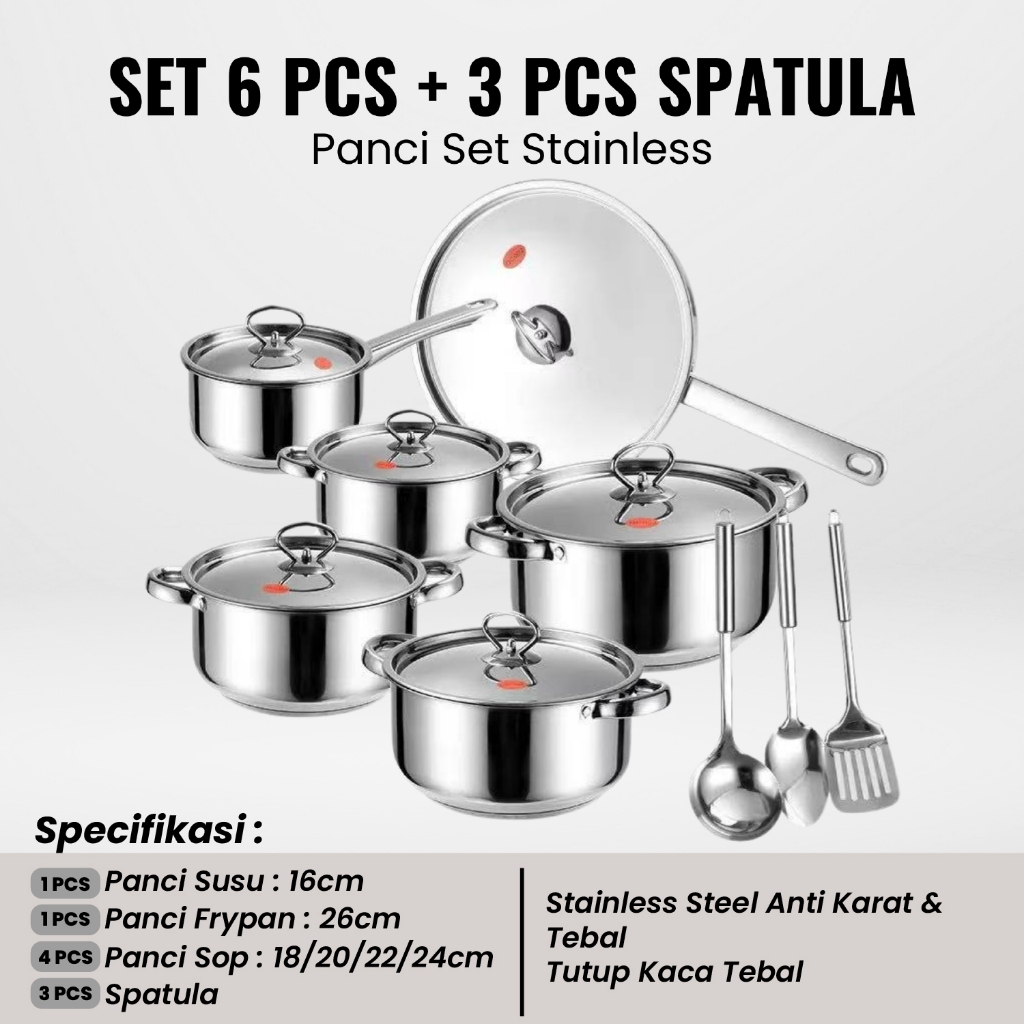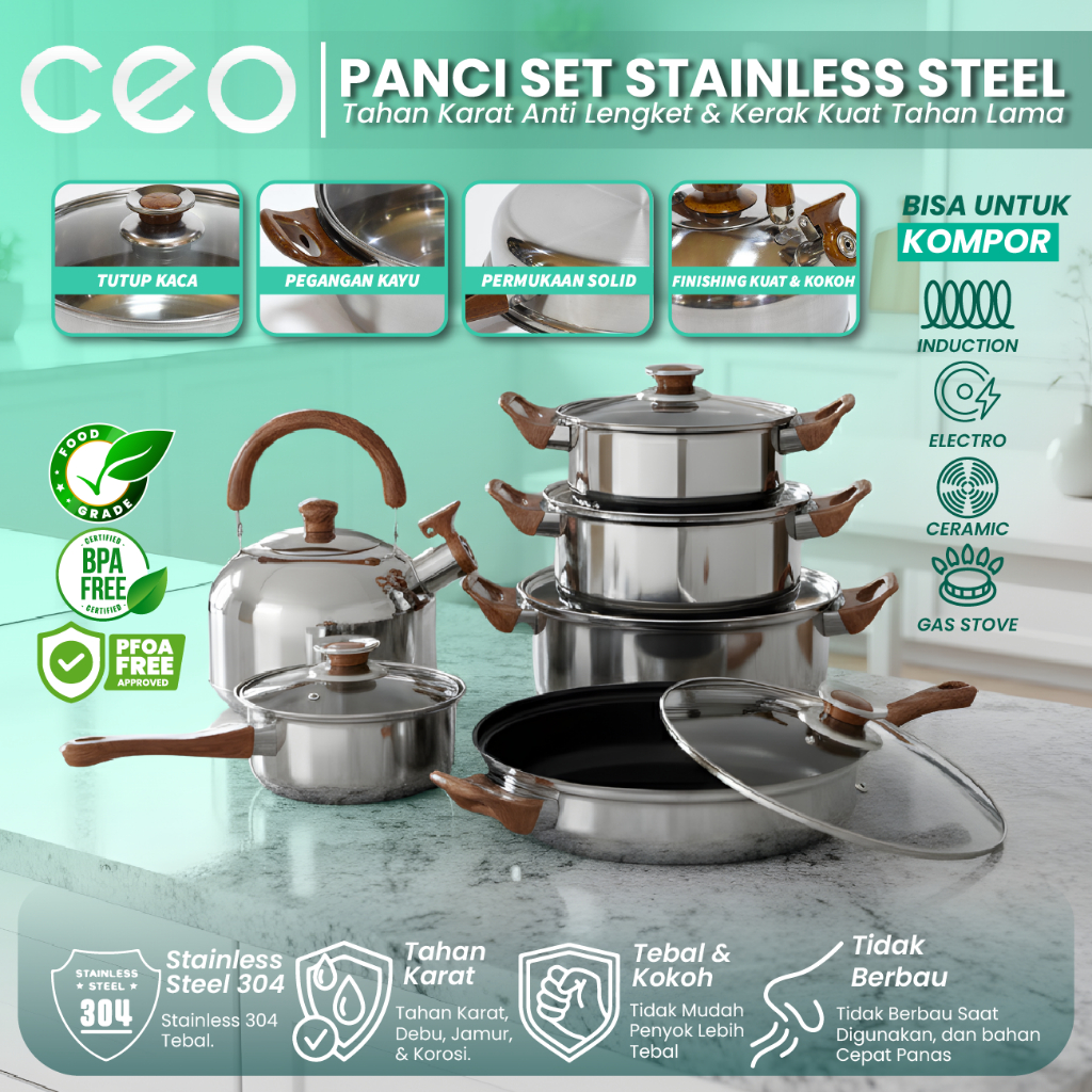 Ceo Paket Set Masak Panci Wajan Isi 6 Pcs Cookware Stainless Steel Anti Lengket Frypan Masak Lengkap