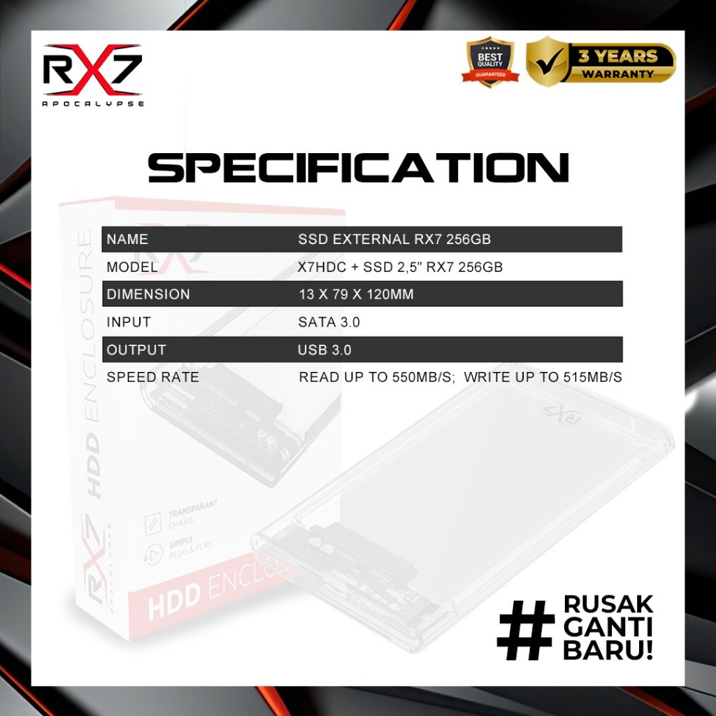 SSD EXTERNAL/ RTABLE/ ENCLOSURE 256GB RX7 USB 3.0 RESMI