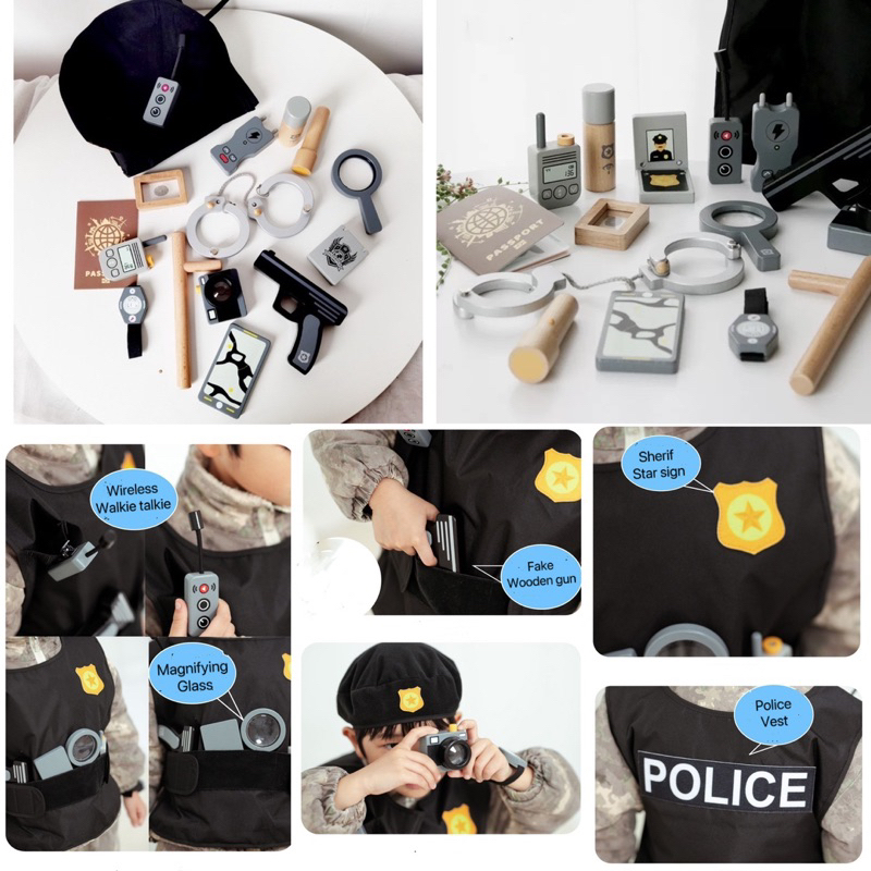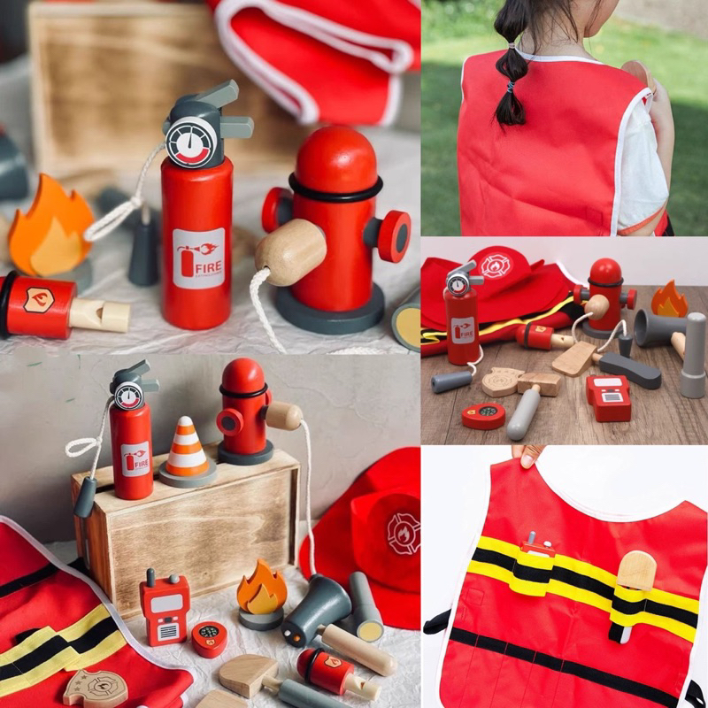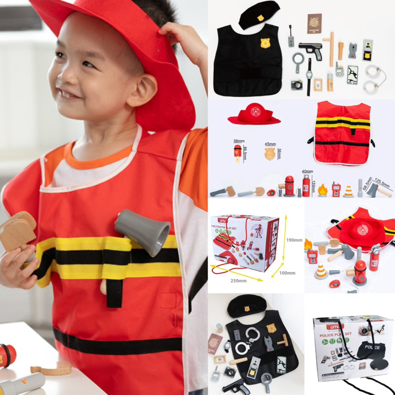 Umu Wooden Police Fireman Play Set Pretend Plays Kostum Polisi Pemadam Kebakaran Anak Mainan Peran Anak