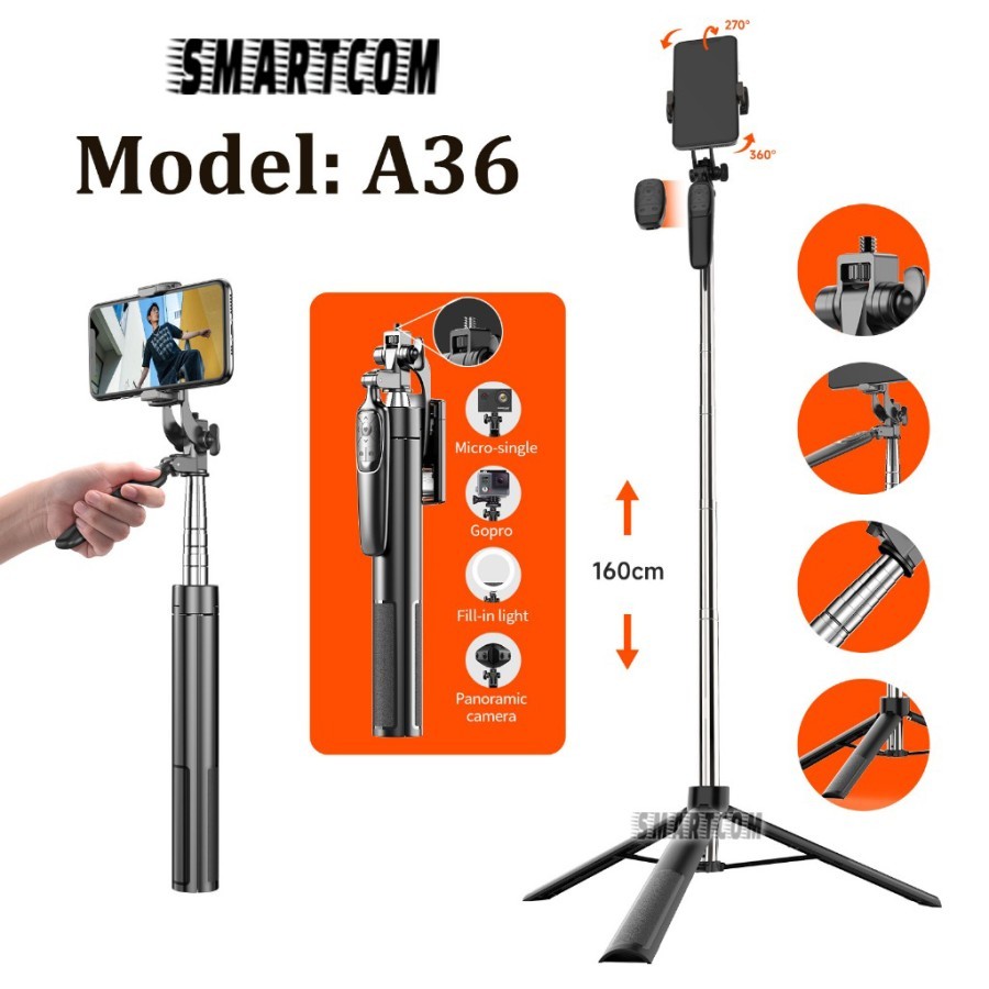 SMARTCOM A36 160 CM Tongsis Bluetooth Selfie Stick Trid Remote Bluetooth Garansi Resmi