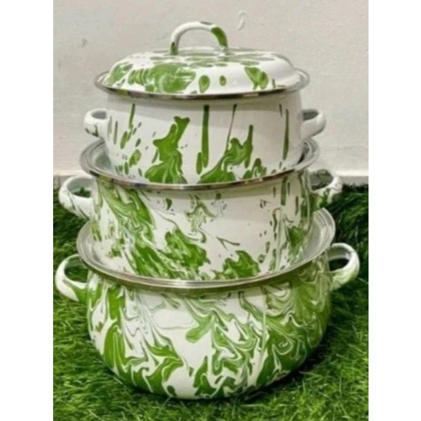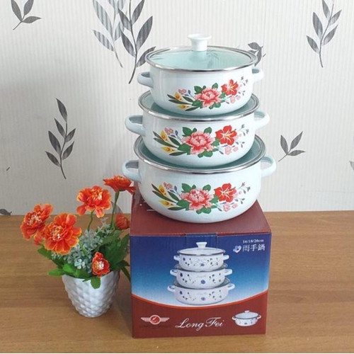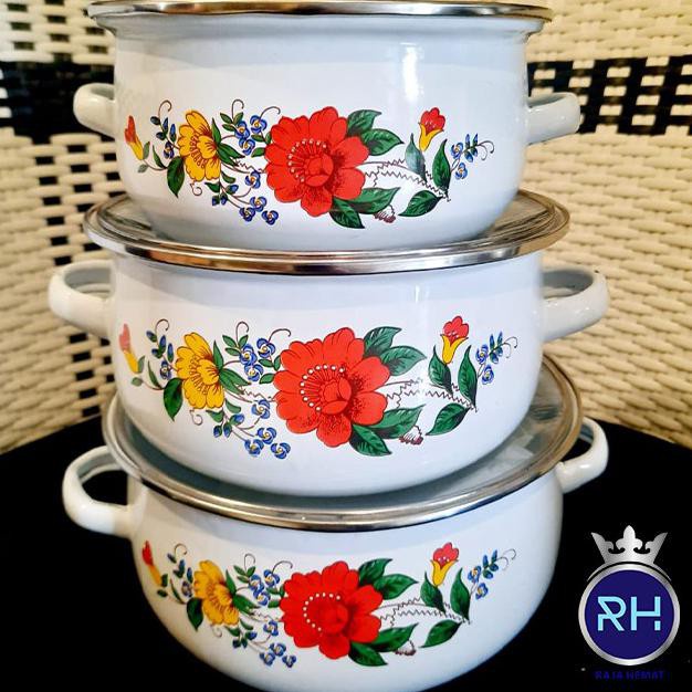 PALING LAKU TERLARIS Panci Set Enamel Motif Kembang 3 pcs / Gratis Packing Double Dus dan Bubble Wrap / Panci Susun Moti