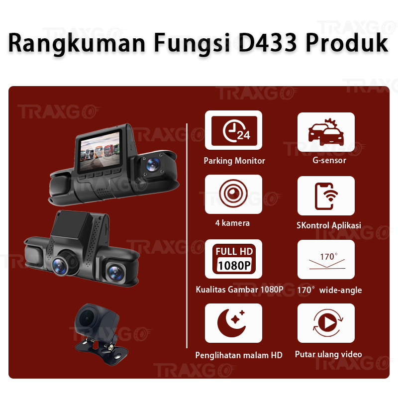 D433 Dash Cam Car Four Camera-Real 1080p FHD + Pemantauan Parkir 24 Jam + Kontrol Koneksi WiFi Seluler + GSensor +