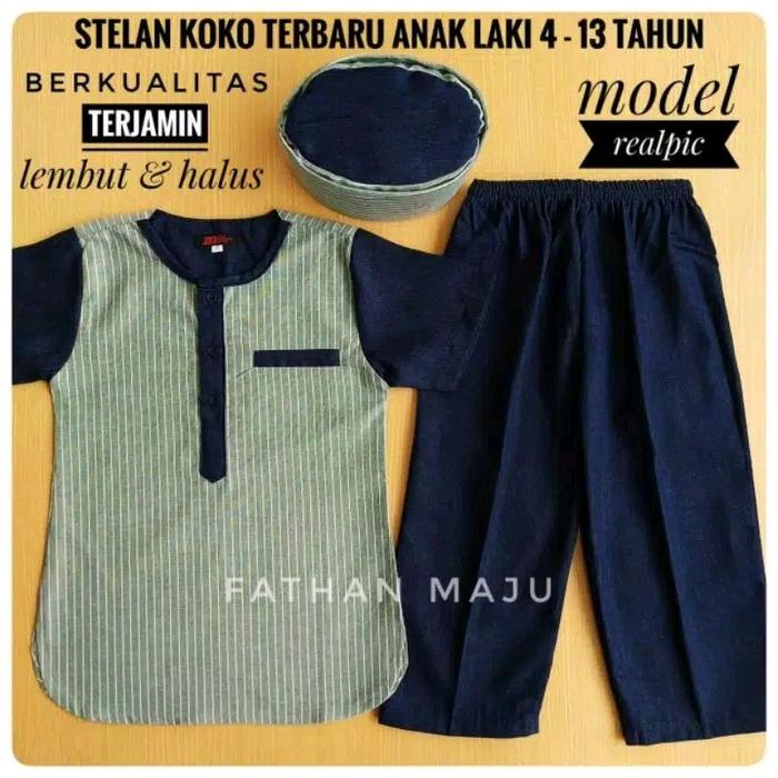 BAJU SETELAN MUSLIM ANAK TERBARU / PAKAIAN MUSLIM ANAK LAKI 4-14 TAHUN TERLARIS CELANA LEMBUT KOKO KURTA TURKI - KOKO JC GARIS HIJAU, 1 = 4TAHUN