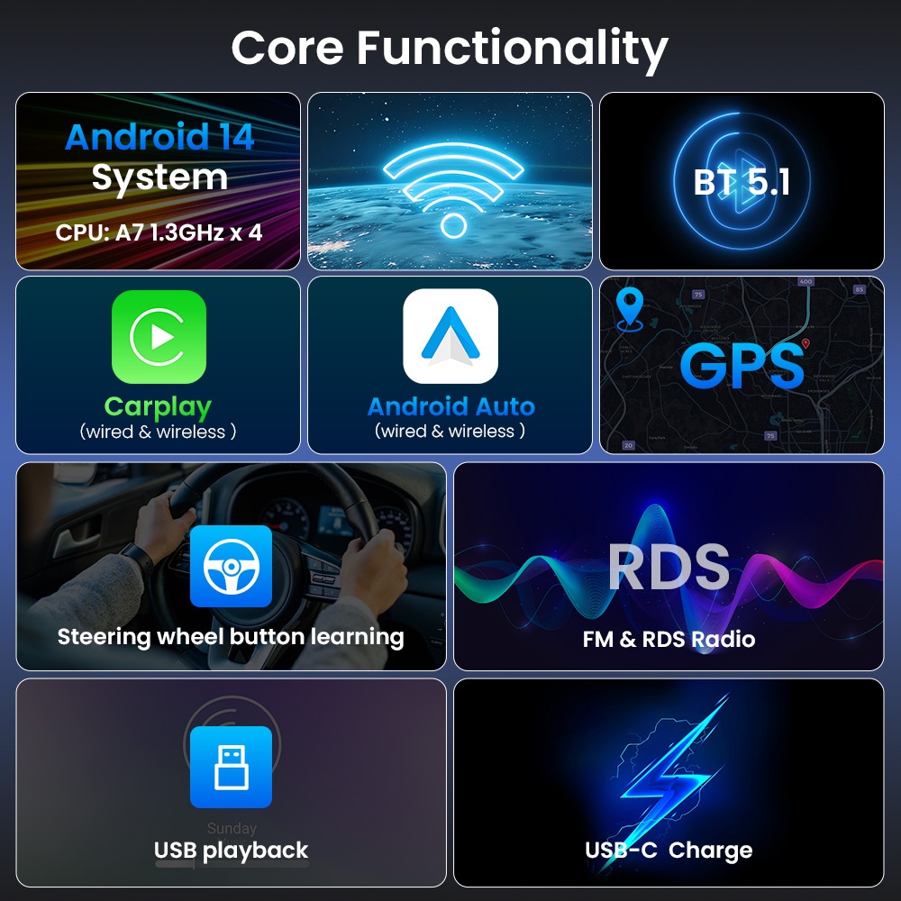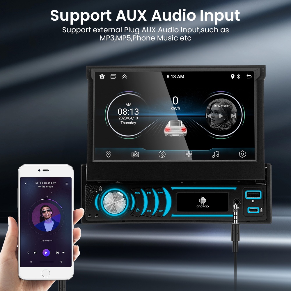 Headunit GEARELEC Single DIN Android 14 4+32G dengan Layar Retractable 7 inci Mendukung WIFI/GPS/Carplay