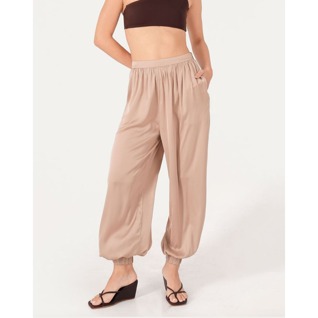 Bamboo Blonde Mauri Pants, Champgne Satin Relaxed Flowy Fit, Zipper, Lightweight, Versatile, Outfit Bali Pantai Party Be