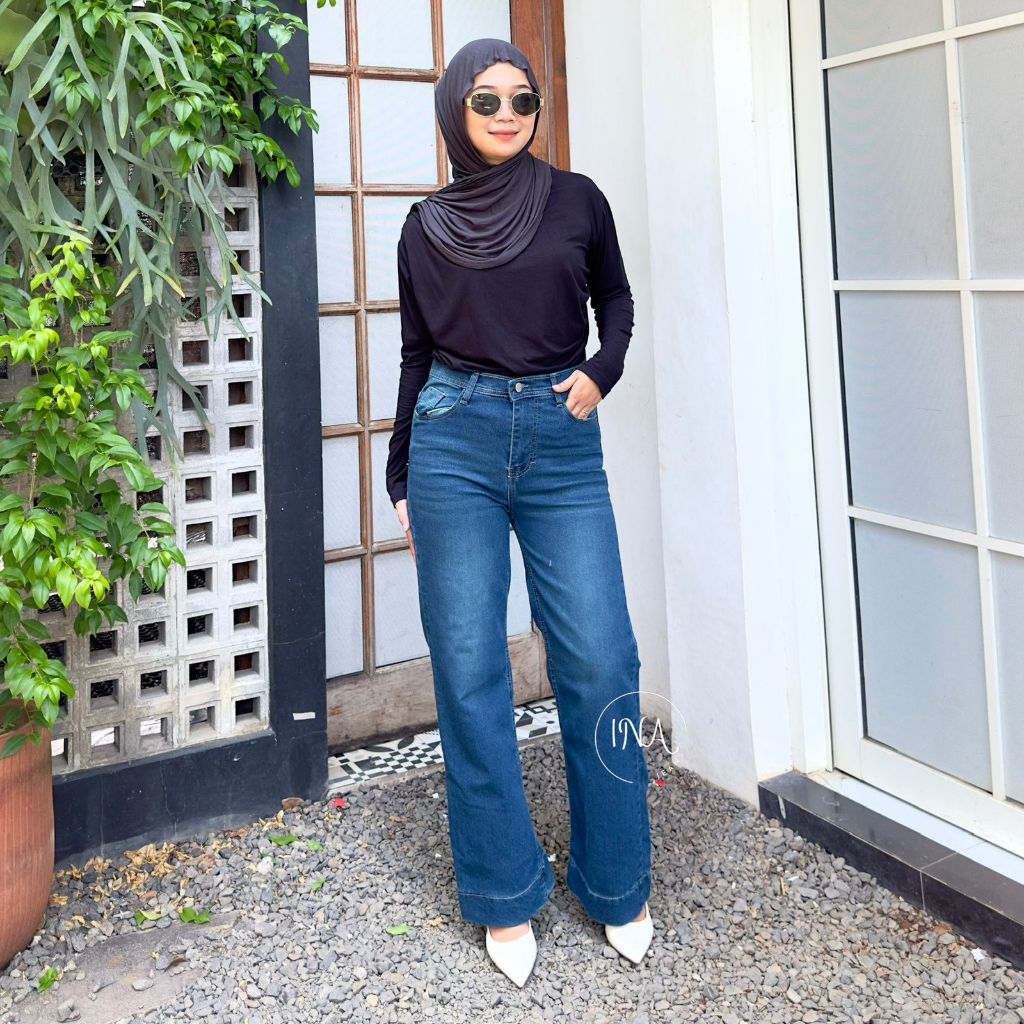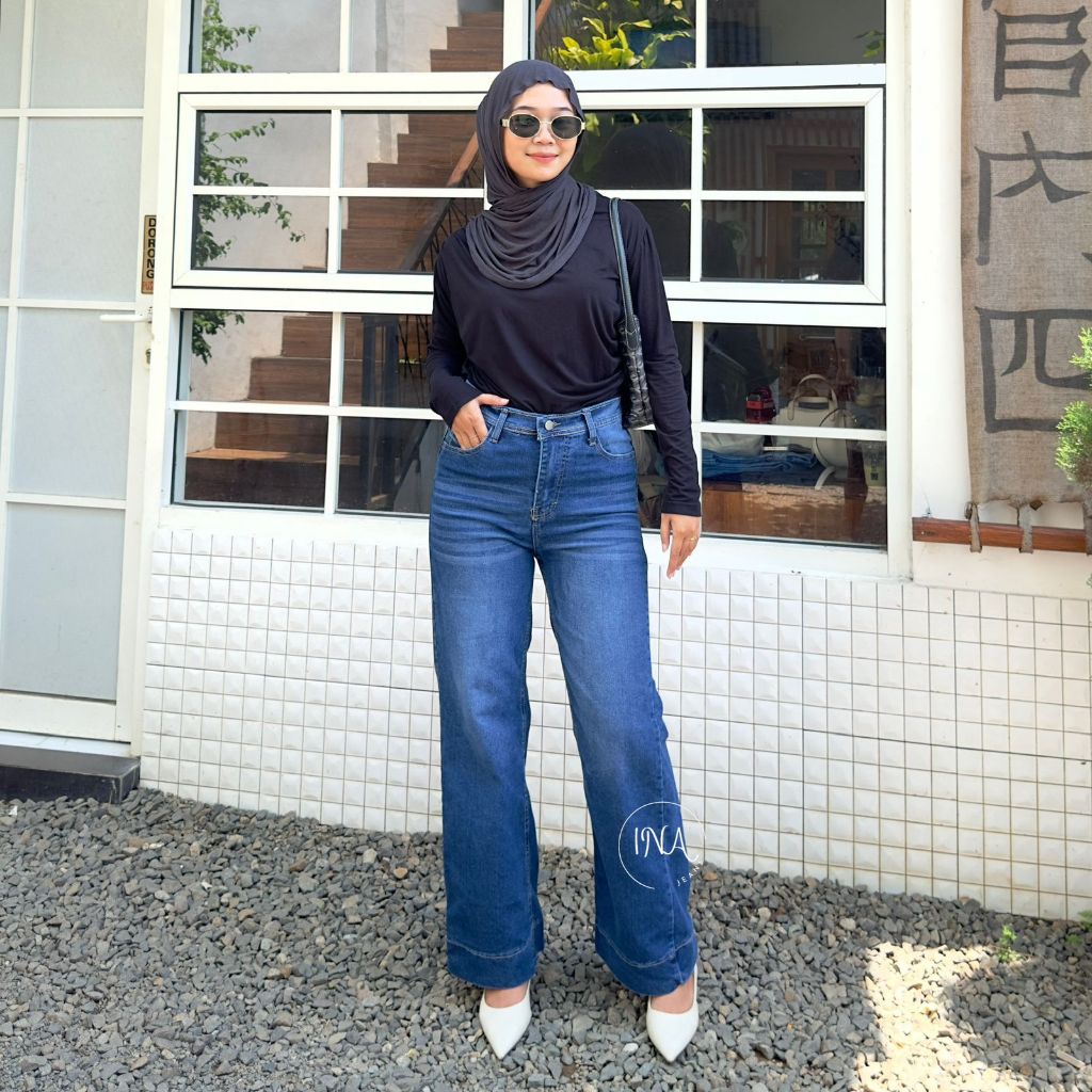 ina jeans - Celana Highwaist Loose Jeans Wanita Lipat Lebar Korean Style - Straight Jeans Baggy Stretch Soft - Celana Panjang Wanita
