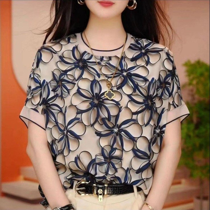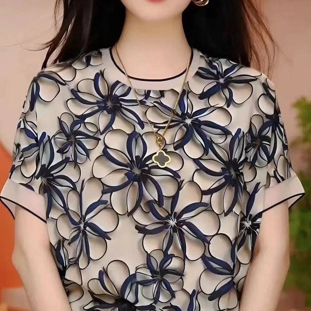 Middle Aged Mom Summer Clothes Lightweight Breathable Short Sleeved T shirt Women's Light Luxury Printed Loose Belly Cov