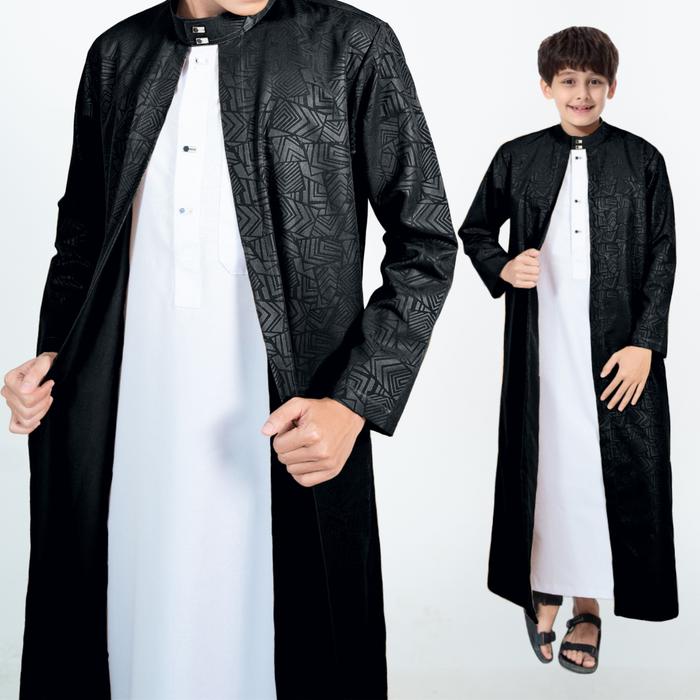 JUBAH LUARAN 2 IN 1 ANAK LAKI-LAKI KAIN EMBOS ANTI GERAH GAMIS MA THOBE ARAB MEWAH ELEGANT KANCING MOTIF MUSLIM KOKO BAJU PANJANG LEBARAN PRIA KATUN - HITAM, NO 6 | 5-6 TAHUN