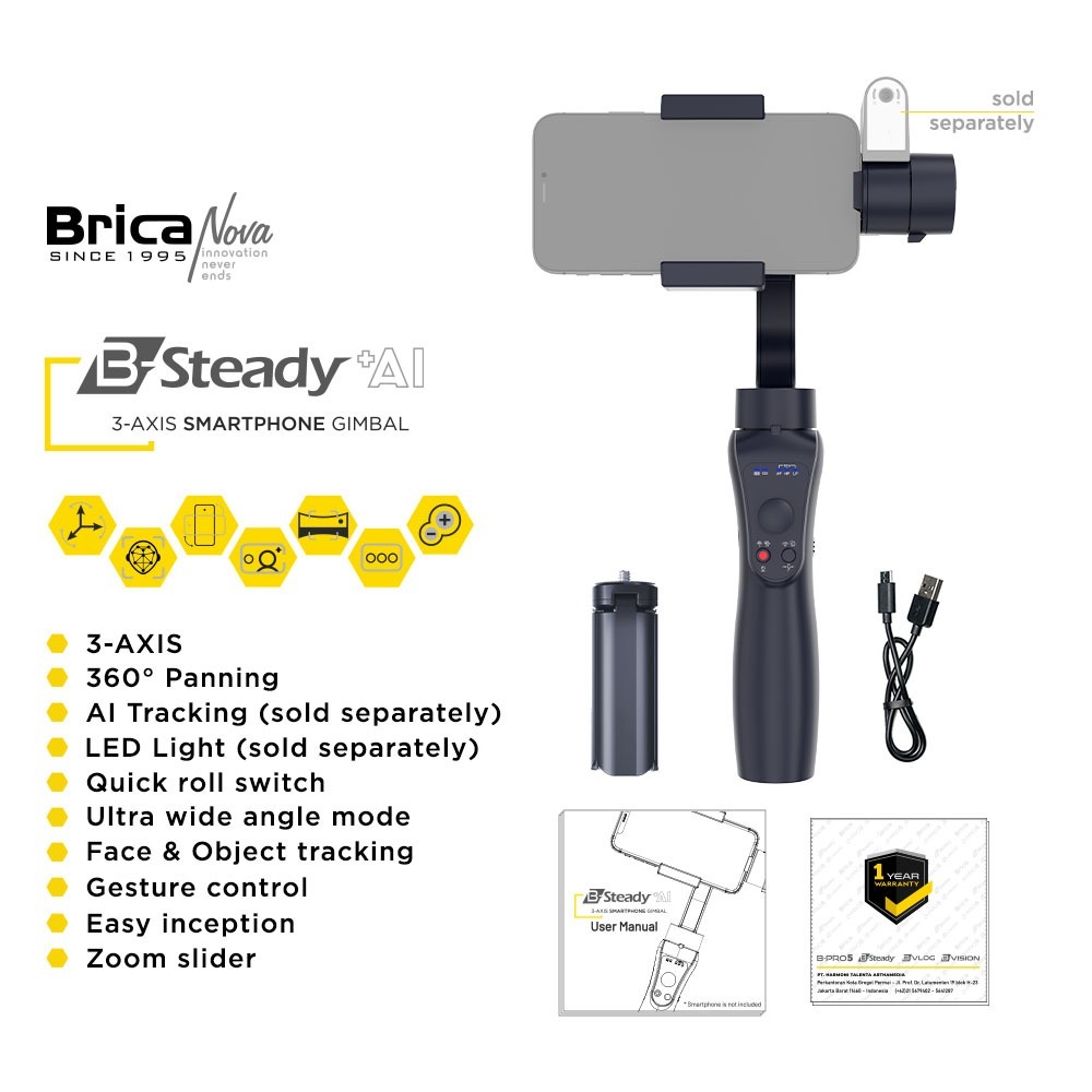 Brica B-Steady AI - BSteady AI 3-Axis Gimbal Stabilizer for Smartphone / HP & Action Cam Garansi Resmi