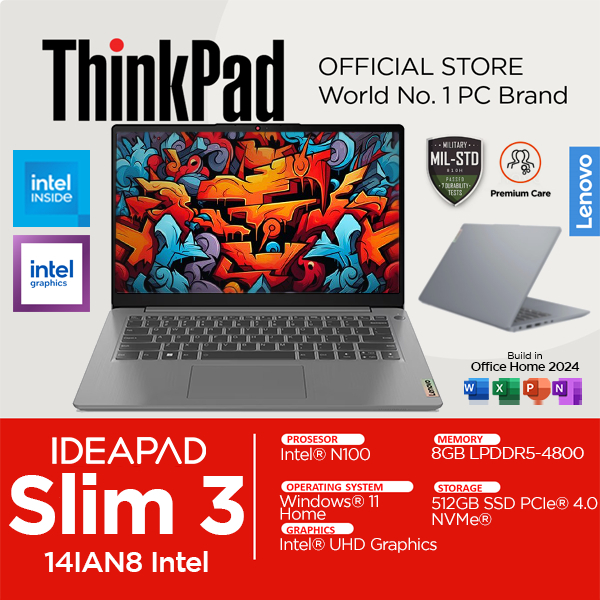 Lenovo IdeaPad Slim 3 Intel N100 8GB 512SSD Windows 11 OHS 14 Inch FHD Laptop UHD Graphic DDR5 62ID