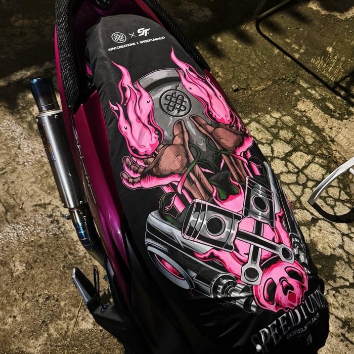 SARUNG JOK FULL PRINT ARVICREATIONS X SPEEDTUNING MENYALAH ABANGKU ANTI CAKAR KUCING & AIR - API ORANGE, JOK KECIL