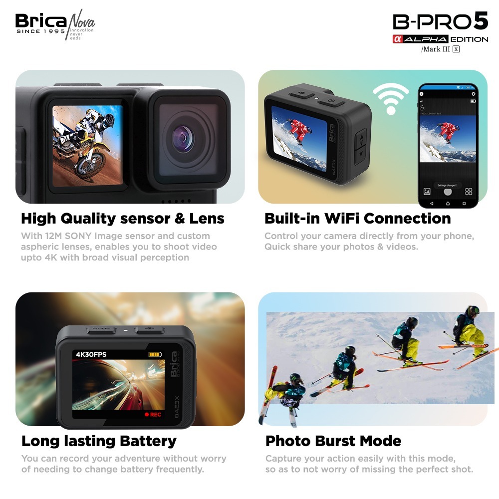 Brica BPRO5 Alpha Edition Mark III X (AE3X) - Mark III S (AE3S) - EIS - Black - Free T-Shirt - BPRO5 Action Cam 4K - BPRO-5 Series