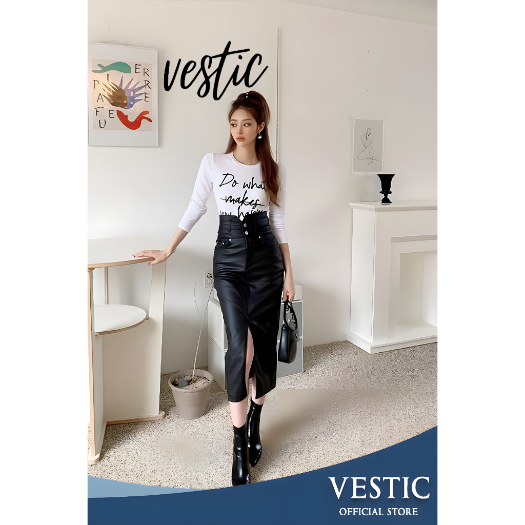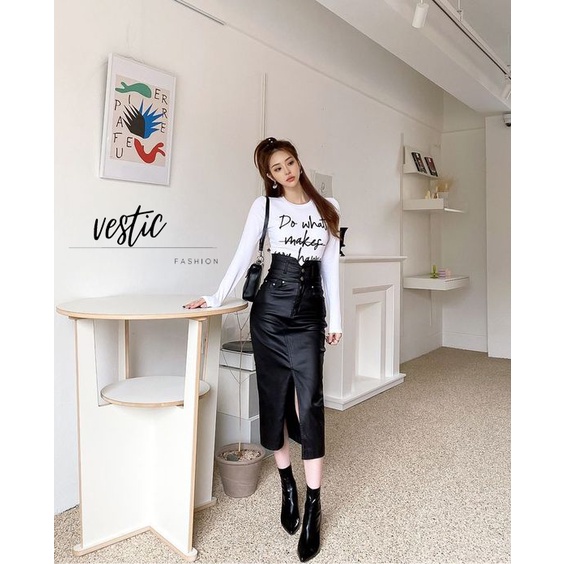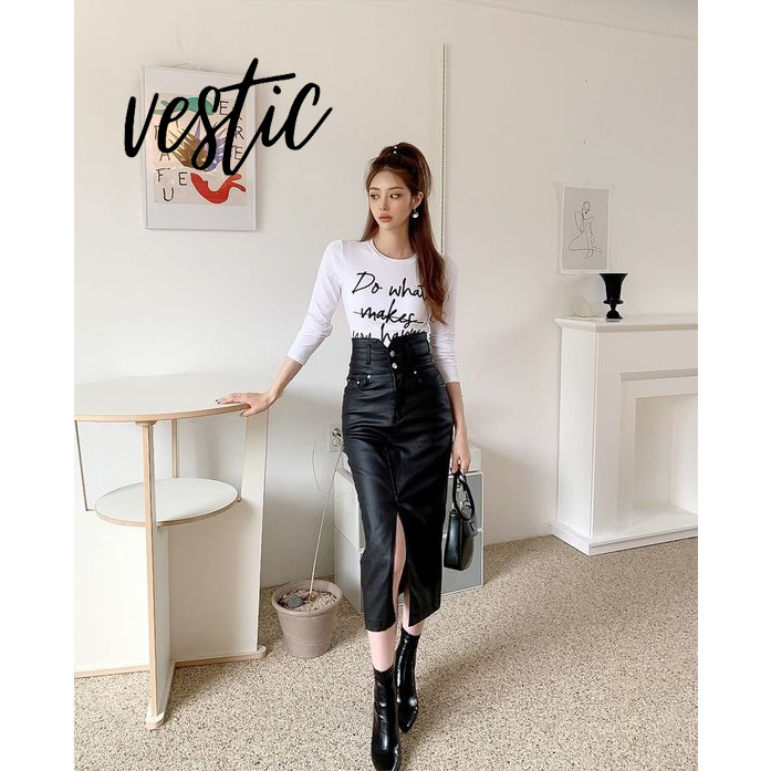 Rok Kulit PU Rok Midi Wanita Korea Style Model Terkini - Warna Hitam by Vestic Fashion