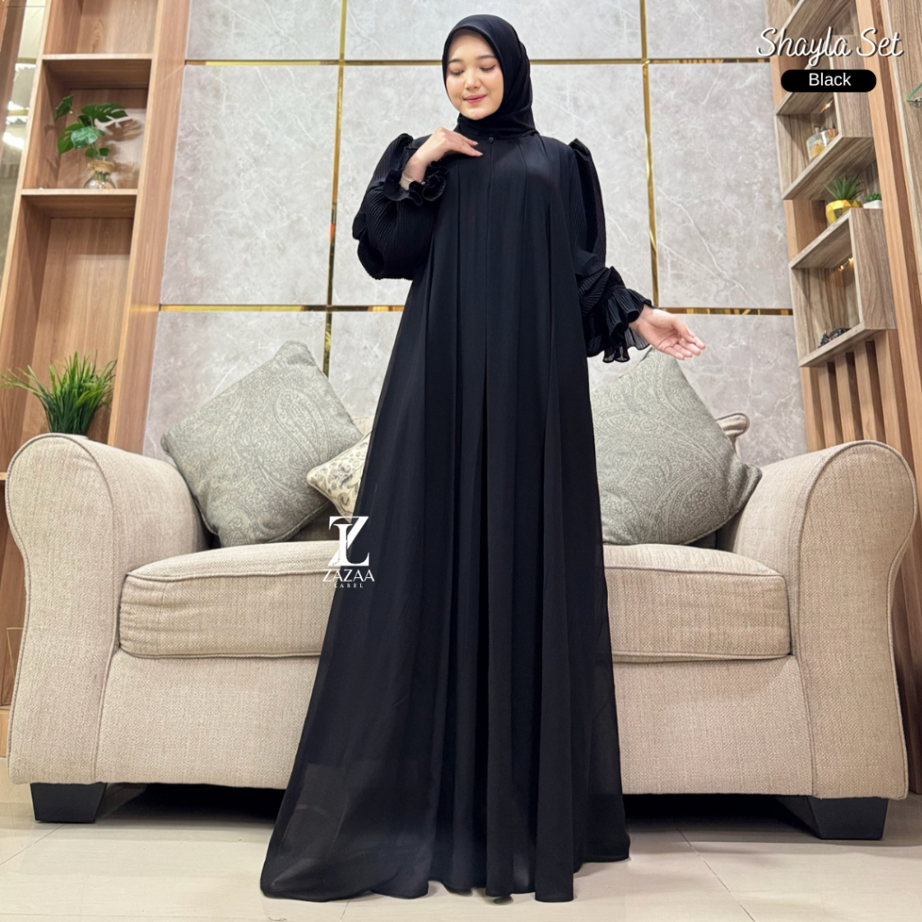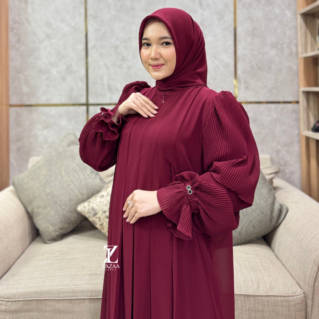 Zazaa Label - Shayla Set Gamis Hijab Ceruty Kombinasi Lengan Plisket Ziper Busui Pesta Mewah