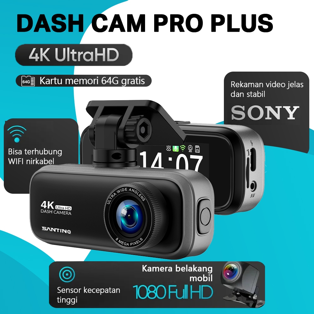 SANTINO Dash Cam Pro Plus V22 Set 4K GPS Dashcam Mobil Perekaman Loop 24 Jam Berisi kartu Memori 64GB