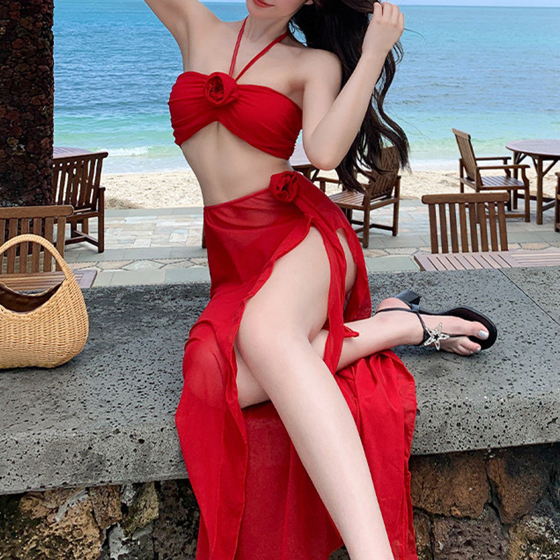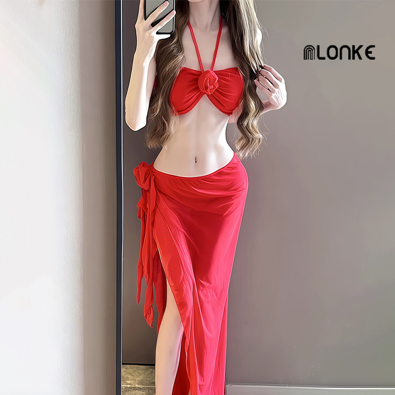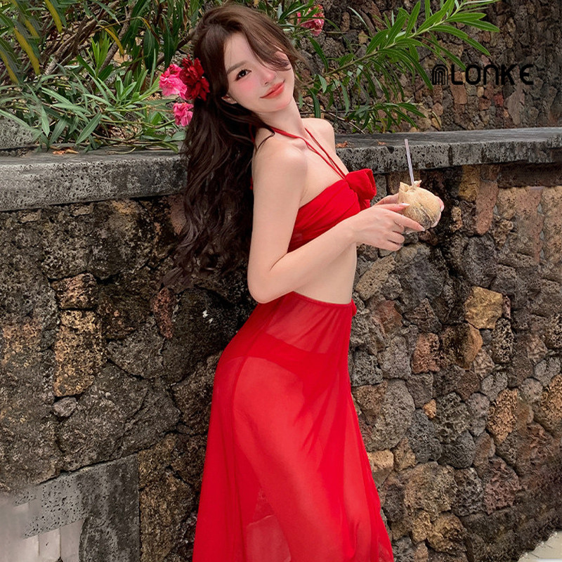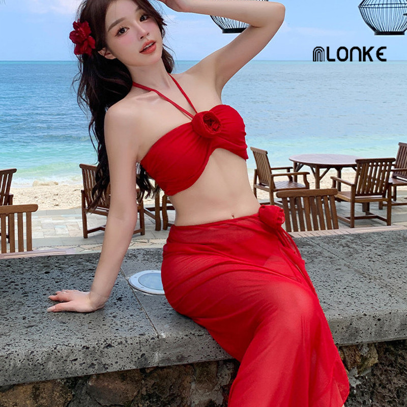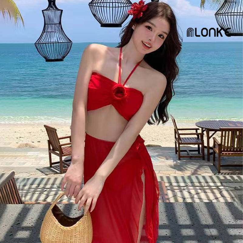 NLONKE - Baju Renang Leher Gantung Merah Wanita Bikini Seksi Rok Pemandian Air Panas Gaya Terpisah