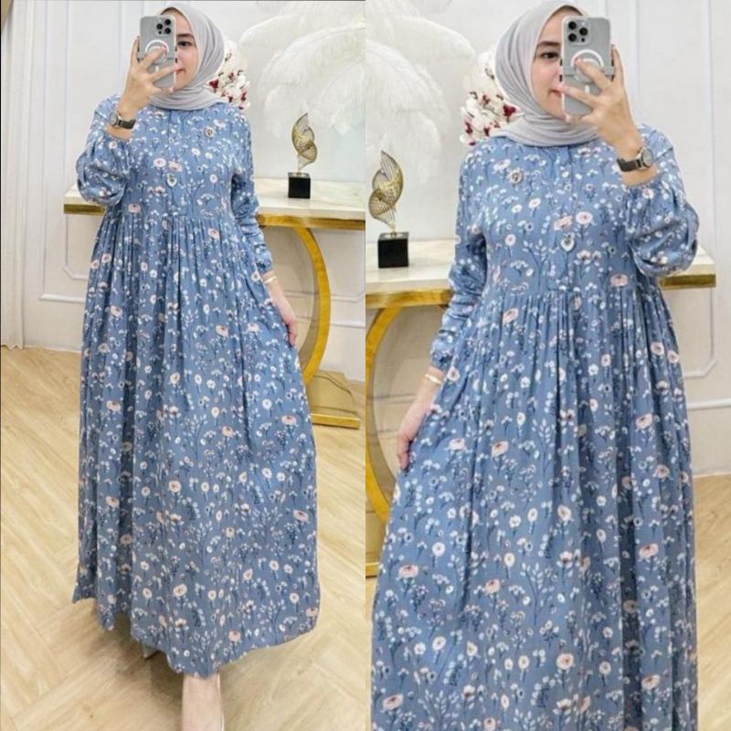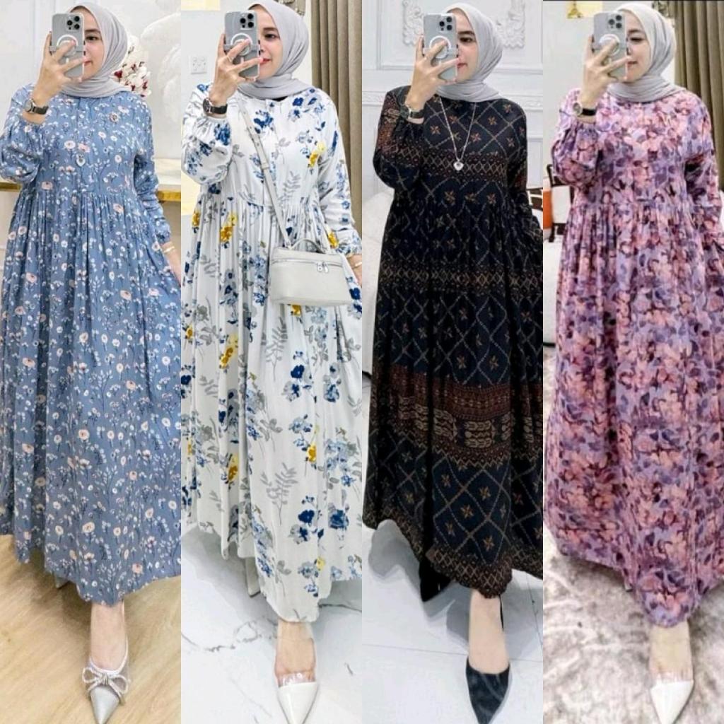 Gamis Midi Dress Rayon Premium Resleting Busui Lengan Karet Wanita Muslimah