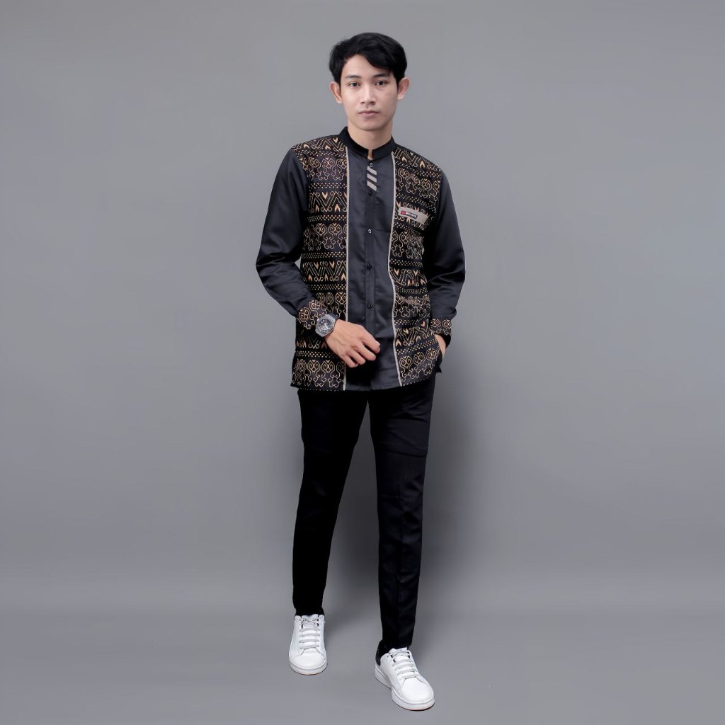 Baju Koko Pria Dewasa El Rumi Kombinasi Batik Motif Jarilist Terbaru Warna Hitam