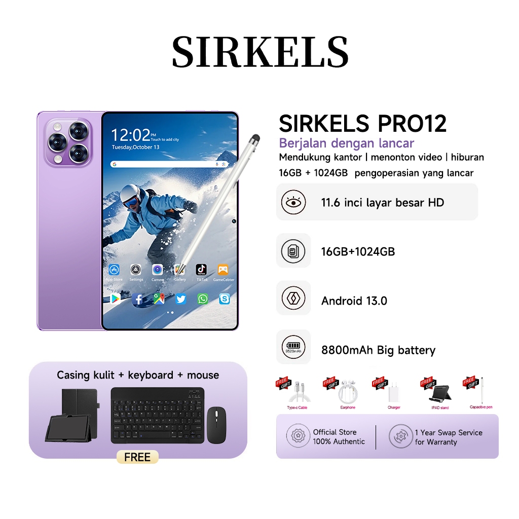 Tablet Pro12 11.6 Inch | RAM 16GB + 1024GB ROM | Layar 8800Mah Full Screen [SIRKELS Official Store]