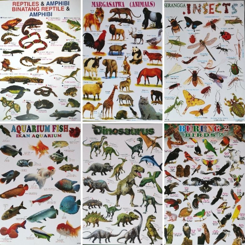 Paket 6 Poster Edukasi / Hewan / Burung / Ikan / Serangga / Dinosaurus / Amphibi