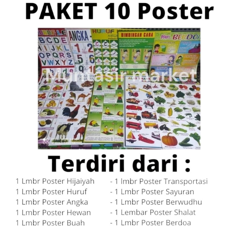 Paket 10 Poster Edukasi Anak ( Hijaiyah, Angka, Huruf, Hewan, Buah, Shalat. Berwudhu, Doa dan Sayuran )