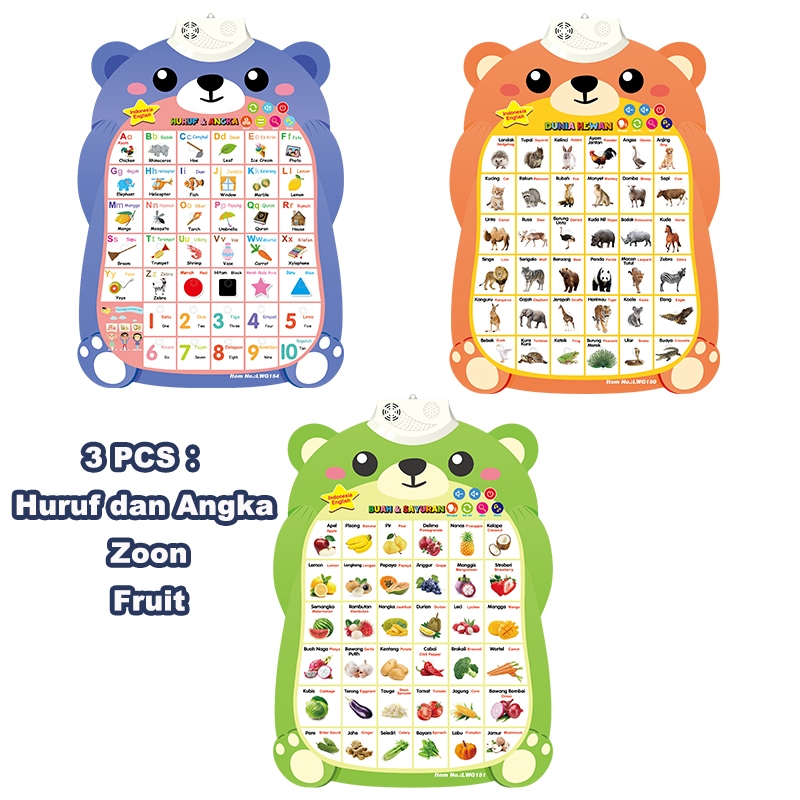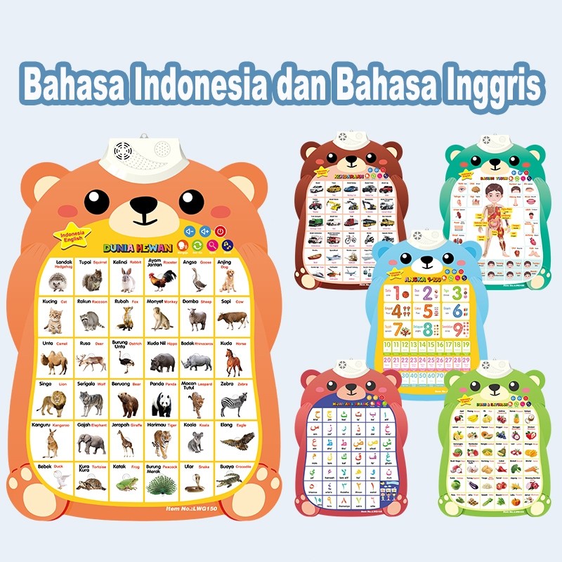 LEIBAO Poster Edukasi Anak Bersuara/Poster Dinding Bahasa Indonesia /Gambar Hewan Edukasi anak