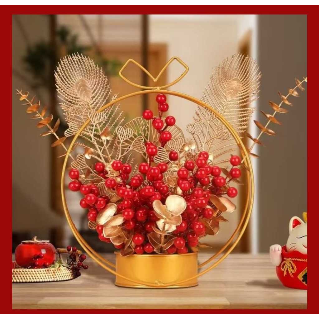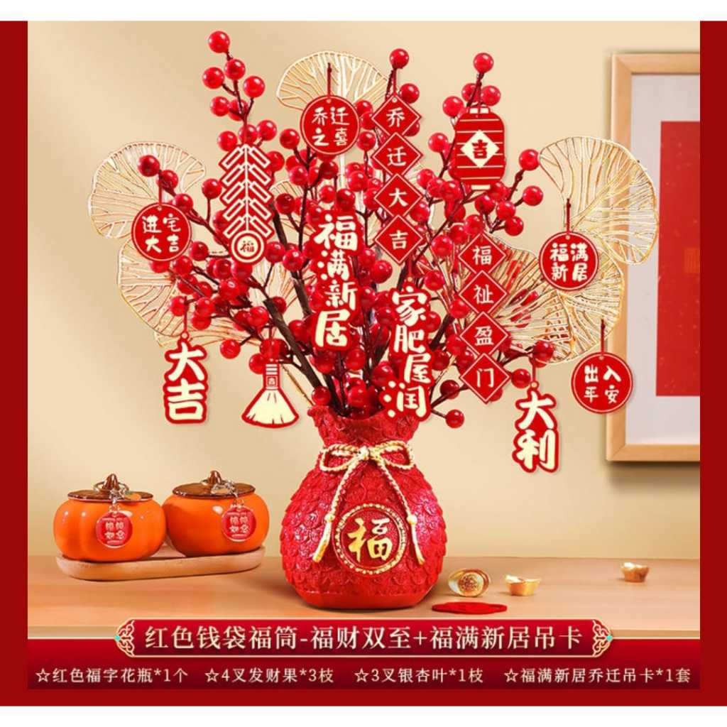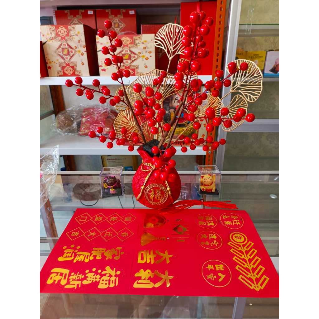 VON Dekorasi Imlek Vas Bunga Red Cherry Set Lengkap Dengan Pot dan Gantungan Sticker