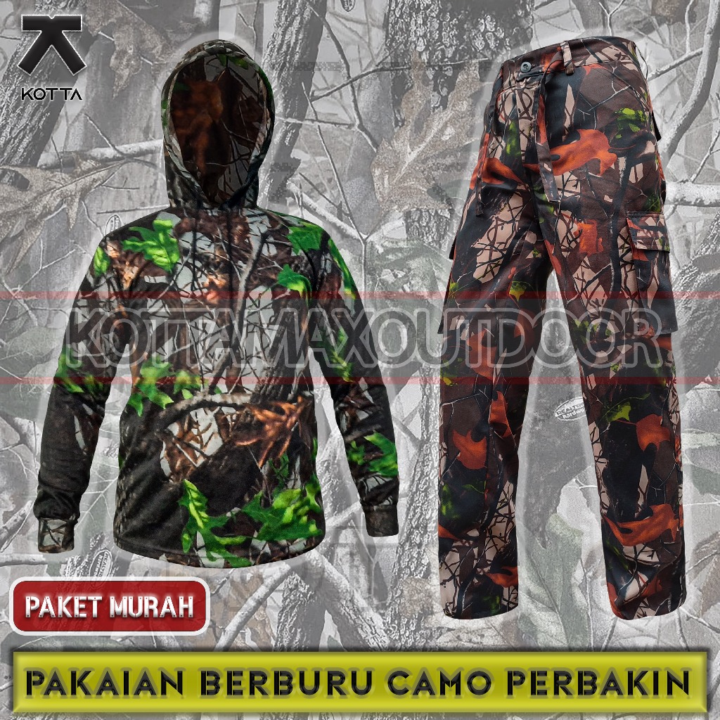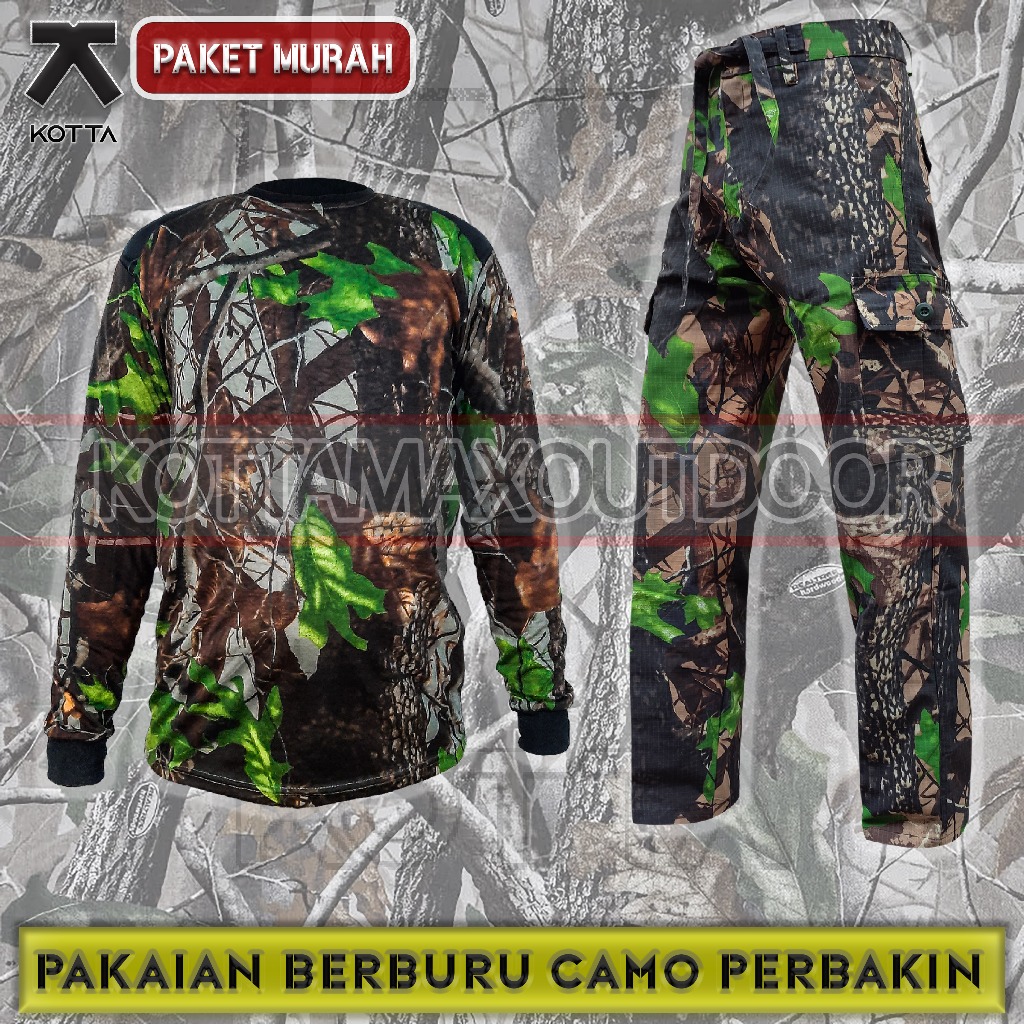 Satu Set Setelan Pakaian Berburu Baju Kaos Lengan Panjang Celana Kamuflase Ranting Camo Perbakin Hunting Berburu