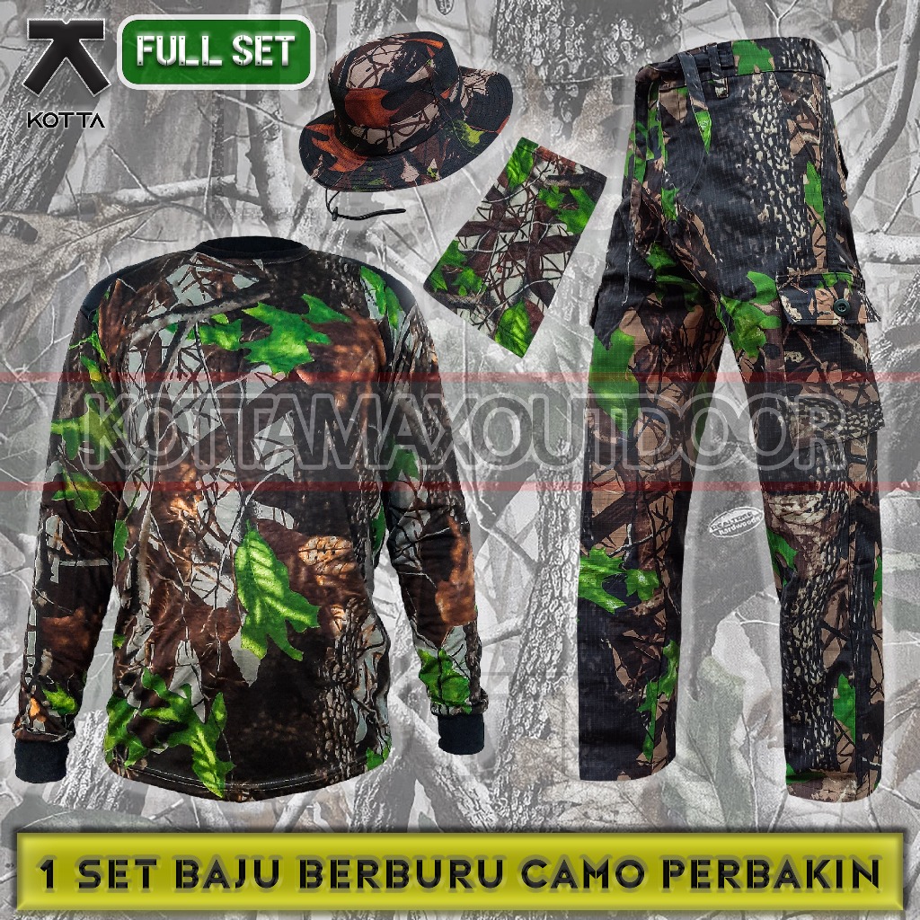 Satu Set Setelan Baju Kaos Decker Busa Celana Topi Rimba Kamuflase Camo Perbakin Hunting Berburu