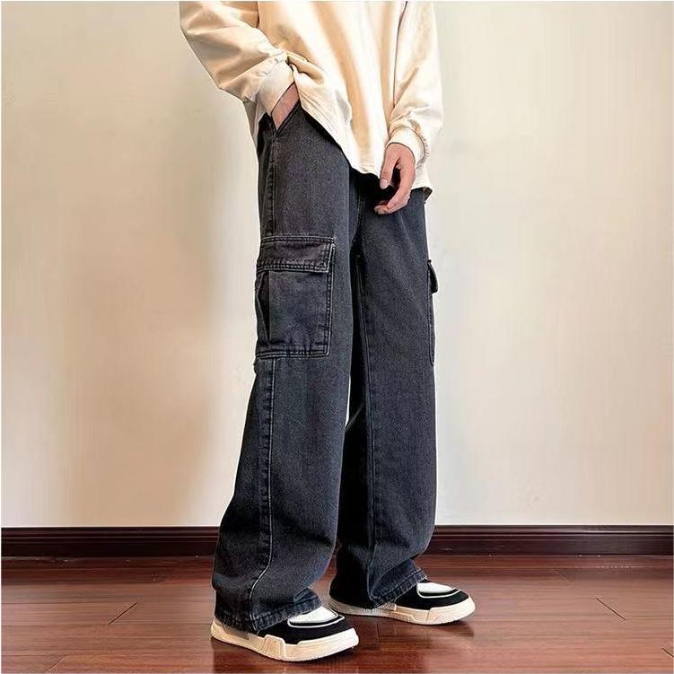 Celana Jeans Pria Cargo Panjang Abu Straight Baggy Dewasa Cowok Oversize Casual Denim Pants Korean Style