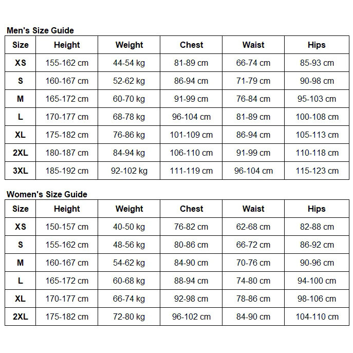 XS, S, M, L, XL, 2XL, 3XL