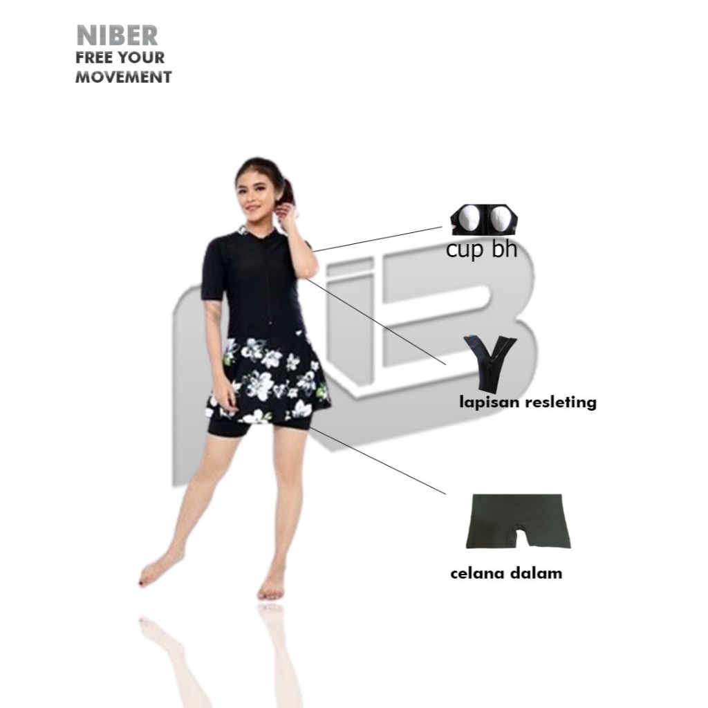 NIBER baju renang ORIGINAL,model rok motif lengan pendek,sudah dilengkapi celana dalam dan cup bra.
