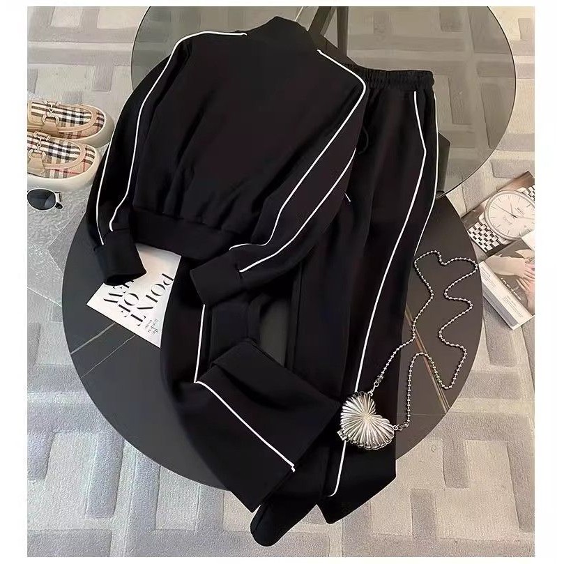 Setelan Pakaian Olahraga Kasual Wanita Modis Lebih Muda Sweter Ritsleting Celana Kaki Lebar Set Dua Potong