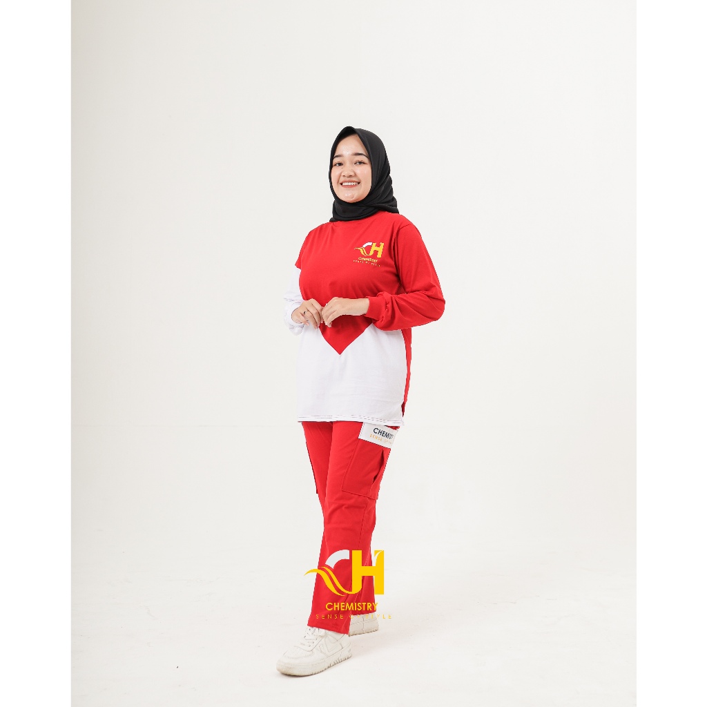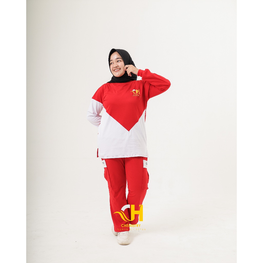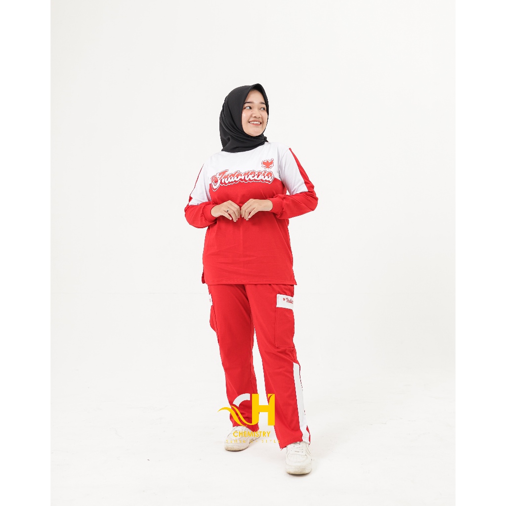 Setelan Olahraga 17 Agustus | Setelan Baju Senam Muslim Wanita Merah Putih