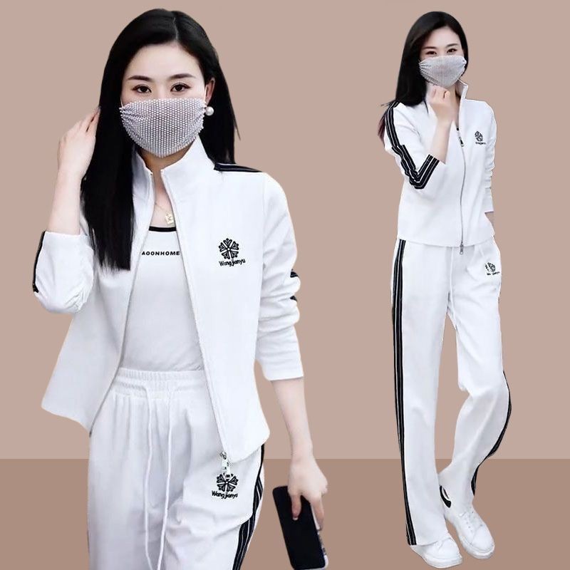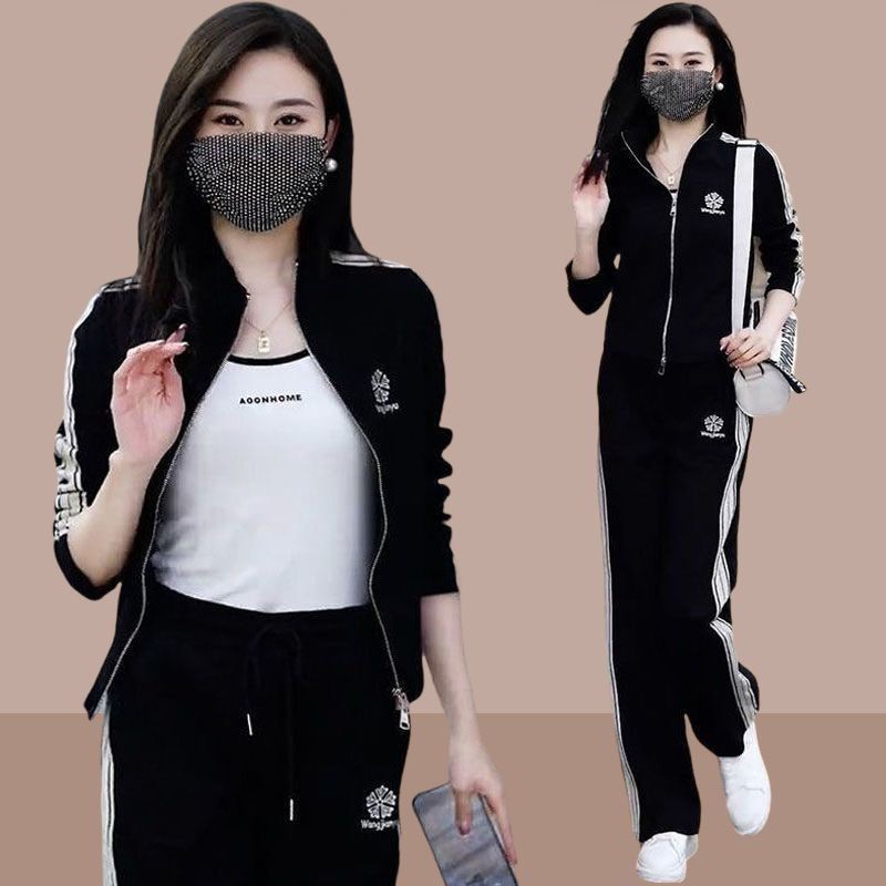 Setelan Pakaian Olahraga Wanita Korea, 3 Potong Celana KakiLebar Anggun CocokLonggar Modis GayaKorea