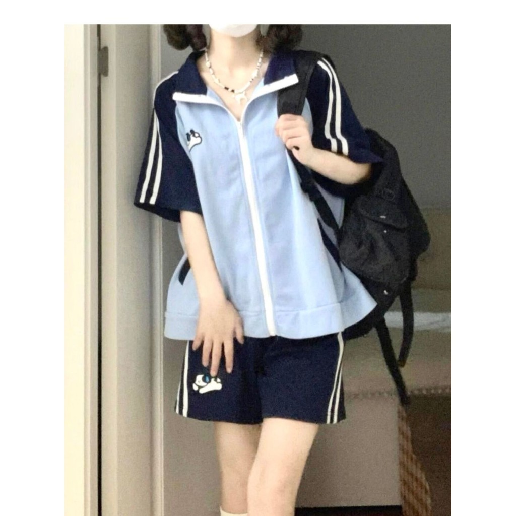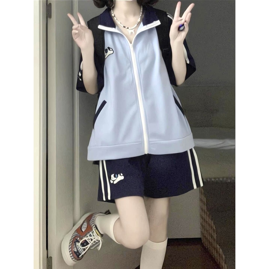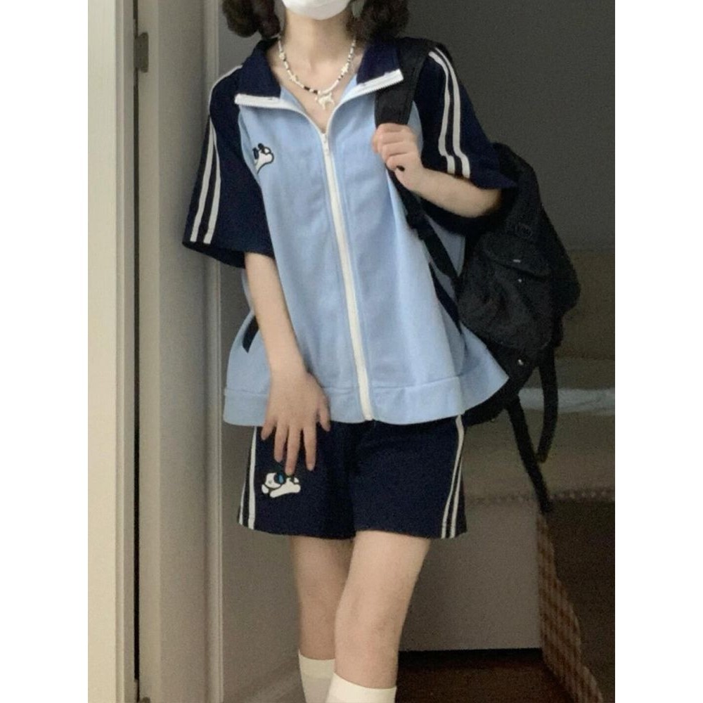 Crunchy Brulee Setelan Pakaian Olahraga Gaya Kuliah Kasual Untuk Wanita Set Dua Potong Siswa Celana Pendek Lengan Pendek