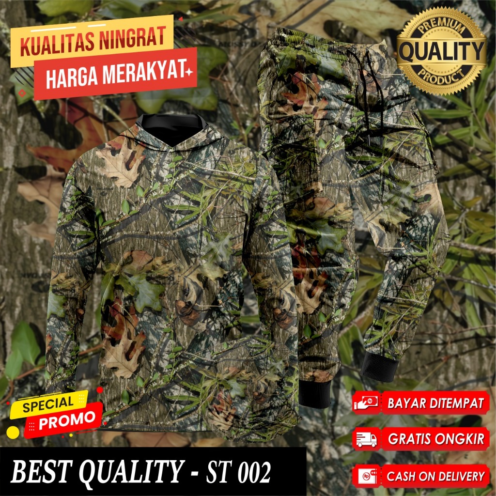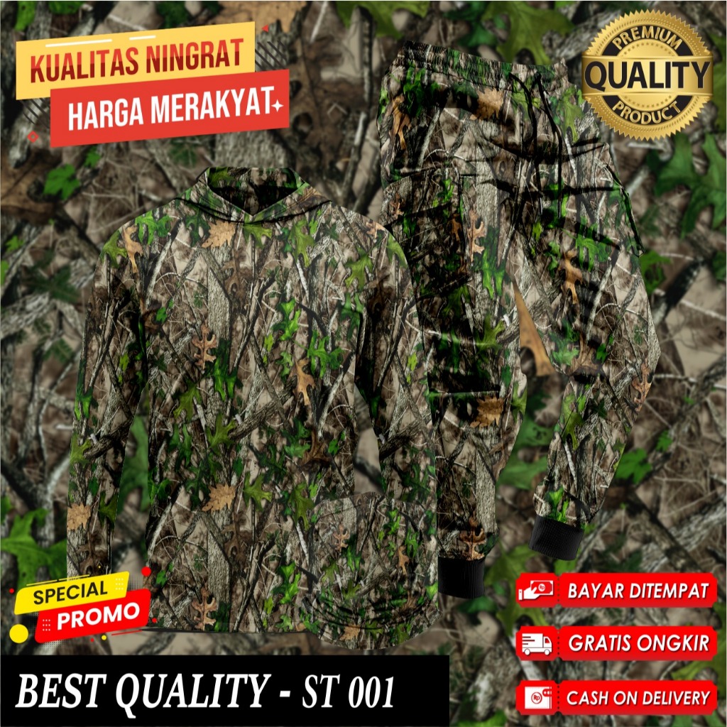 Setelan Baju Camo Hoodie Berburu Hunting Baju Berburu Hutan Kamuflase 1 Set Buff Celana Camo ST-031