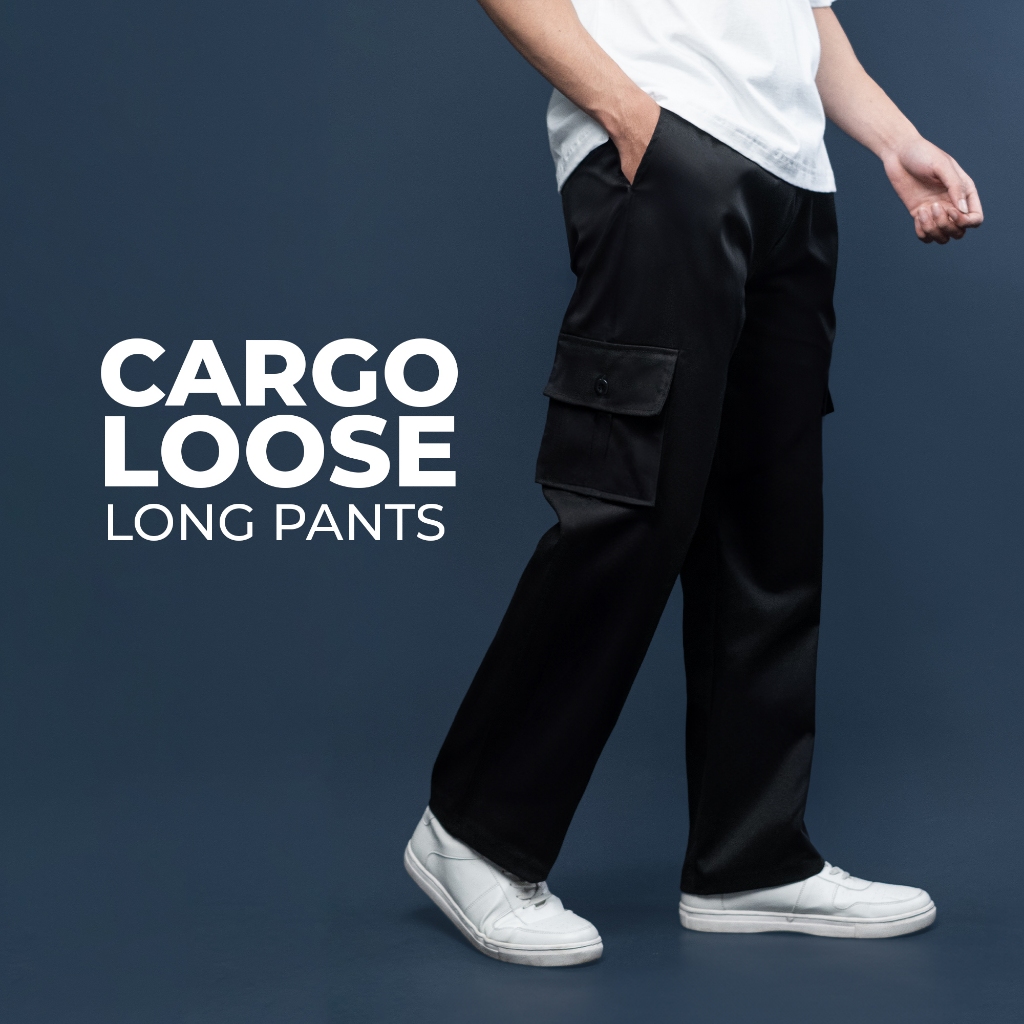 Fatto A Mano Celana Cargo Loose Fit Long Pants Pria Baggy Cotton Twill Tebal Hitam Black