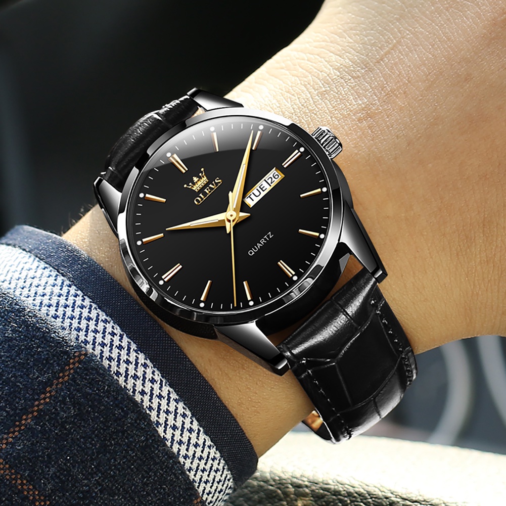 OLEVS Jam Tangan Pria Original Anti Air Tahan Kulit Analog Men Watch Hitam Putih Biru