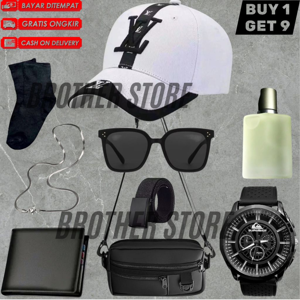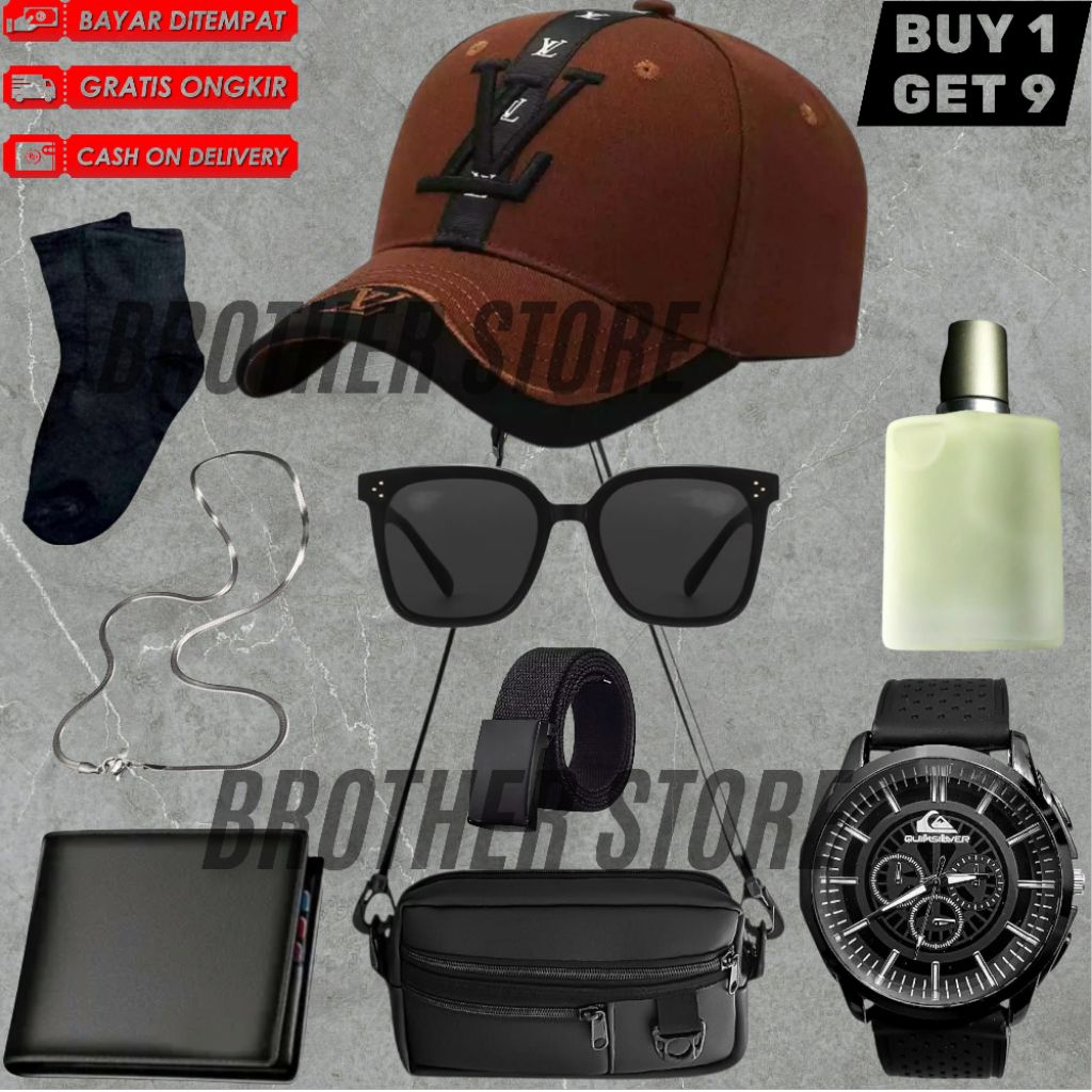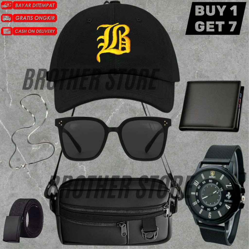 Brother Store kuning mengkilap Jam Tangan Pria Terkomplit Bundling 12in1&9in1&7in1 Jam Pria Keren Gratis Tas Selempang,Topi,Gelang,