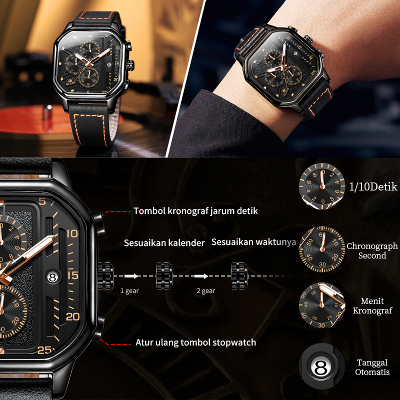 OLEVS Jam Tangan Pria Original Anti Air Kulit Tahan Keren Led Hitam Coklat Luxury Chronograph Watch Men Multifungsi