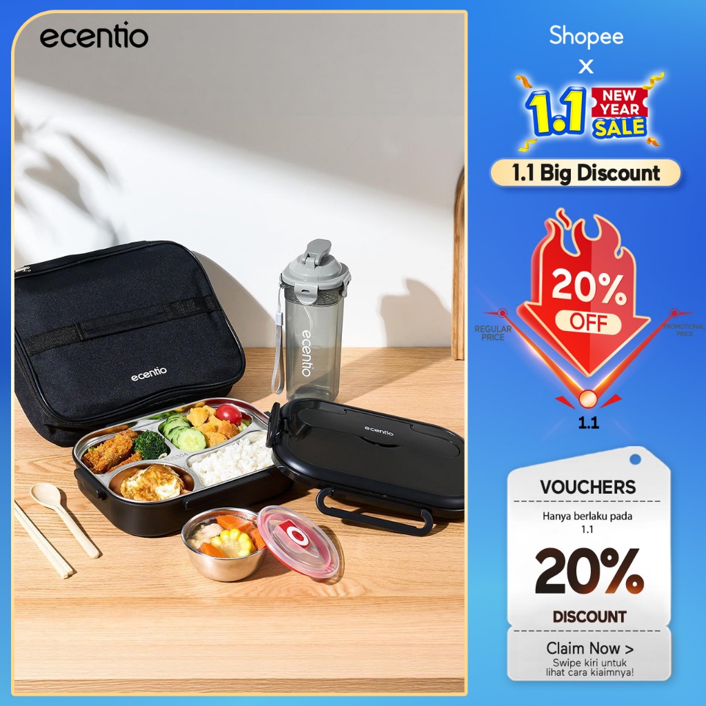 3 set Ecentio tempat makan stainless lunch box /Kotak Makan 4 Sekat Tahan Panas Dan Anti Tumpah tempat makan Murah Grati
