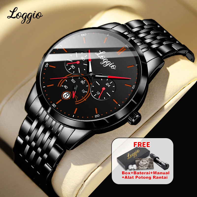 Loggio Jam Tangan Pria Original Display Kuarsa Cahaya malam Anti Air Tali Stainless Steel Santai Mode Jam Tangan Cowok
