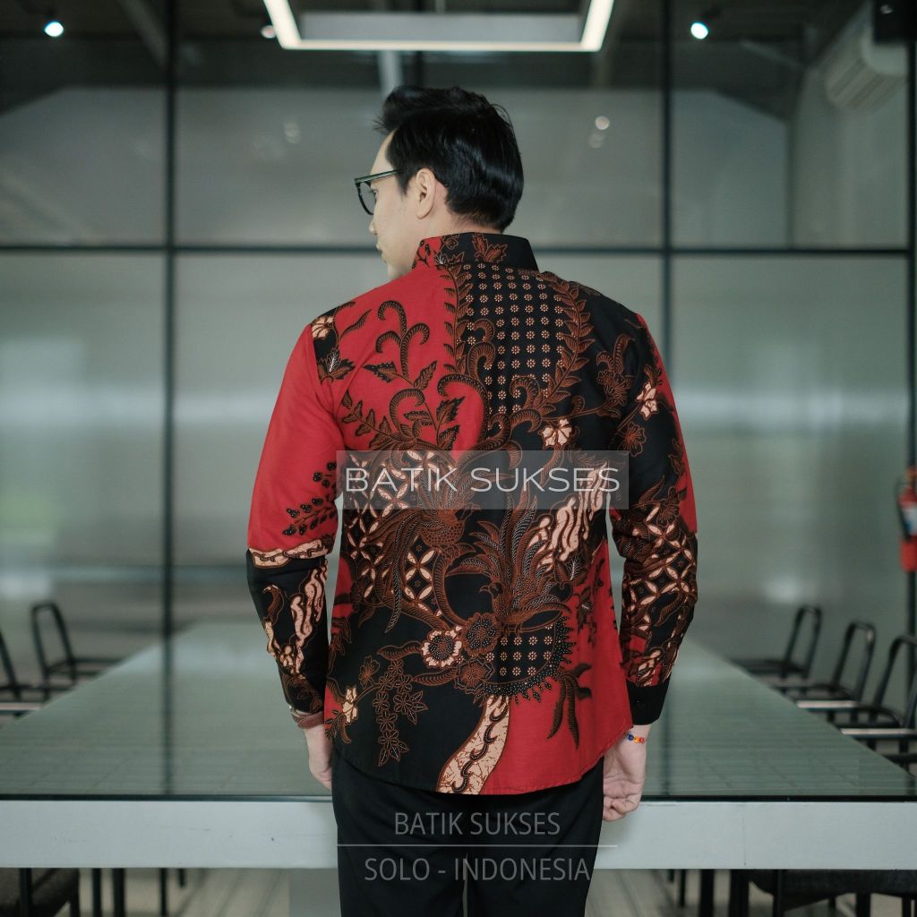Jayanegara Kemeja Batik Pria Slimfit Lengan Panjang Katun Halus Full Furing Batik Solo Merah Hitam