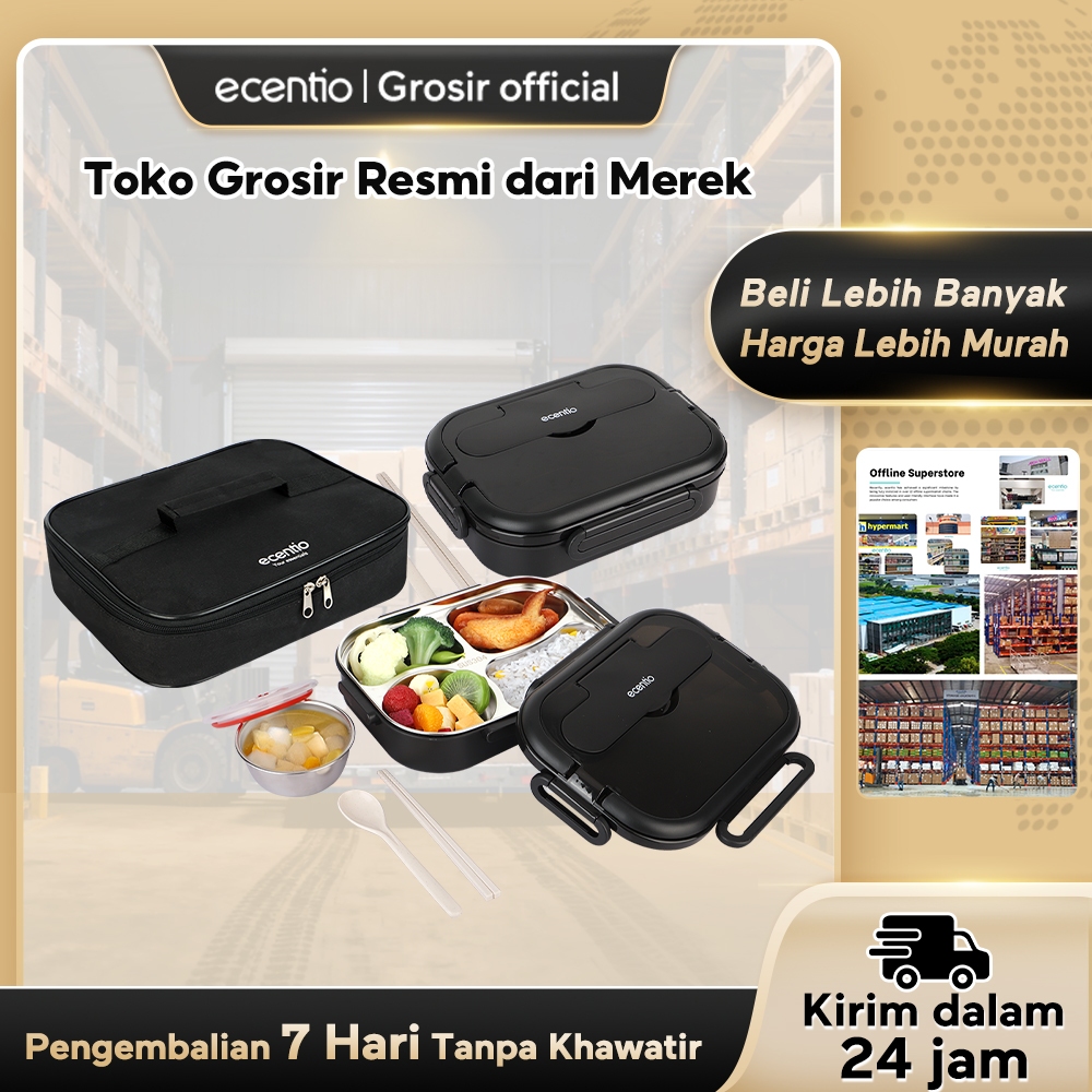 ecentio anti tumpah Kotak Makan set 304 Stainless Steel 4 Sekat Tempat Makan Tahan Suhu 1L/1.2L/1.5L Free sendok Sumpit