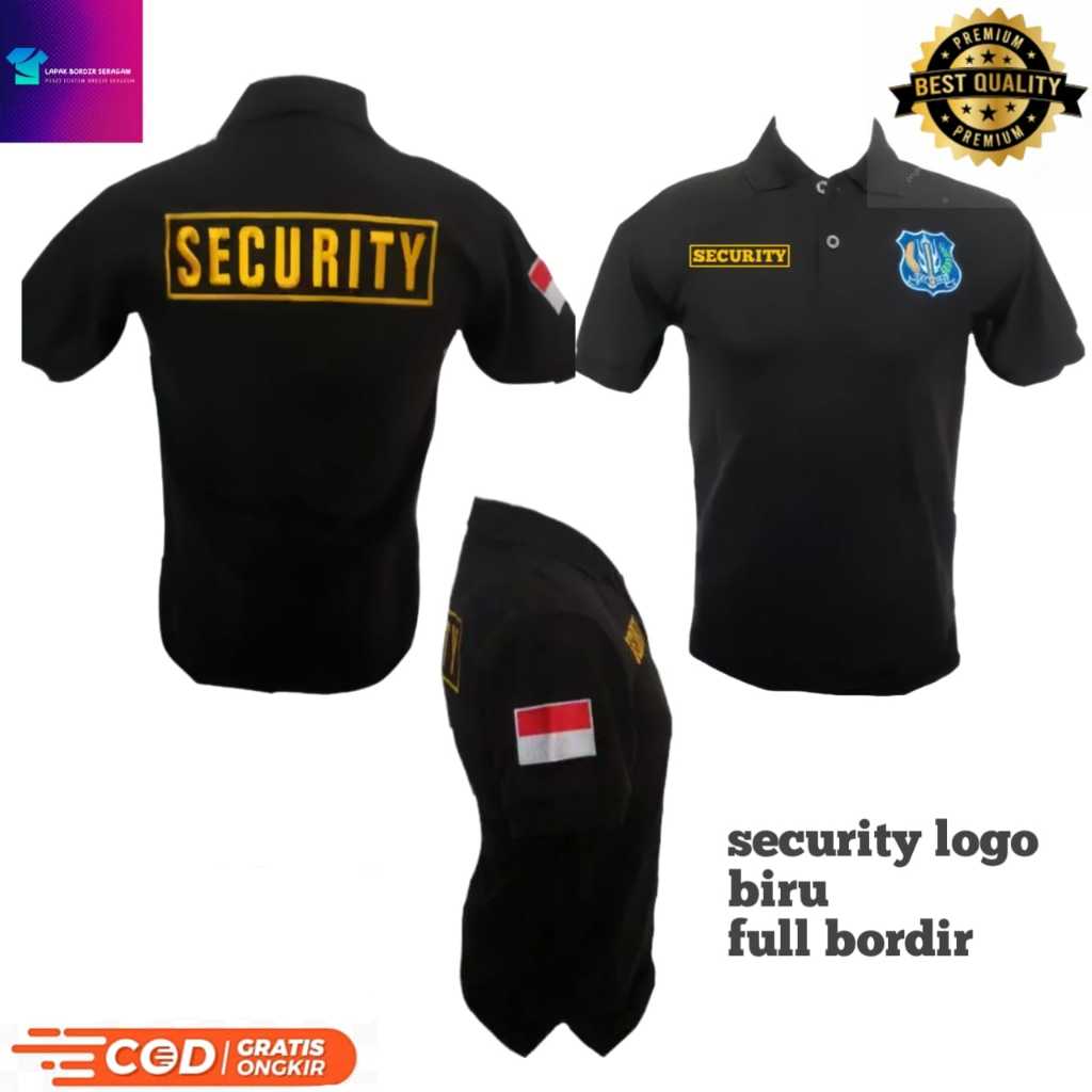 BAJU KERAH SECURITY LOGO BIRU KHUSUS WARNA HITAM FULL BORDIR BAHAN LACOSTE LBS